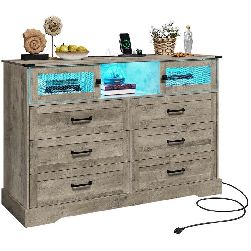 Sikaic 6 Drawers LED Dresser with Outlets Rustic Wood Top Cabinets