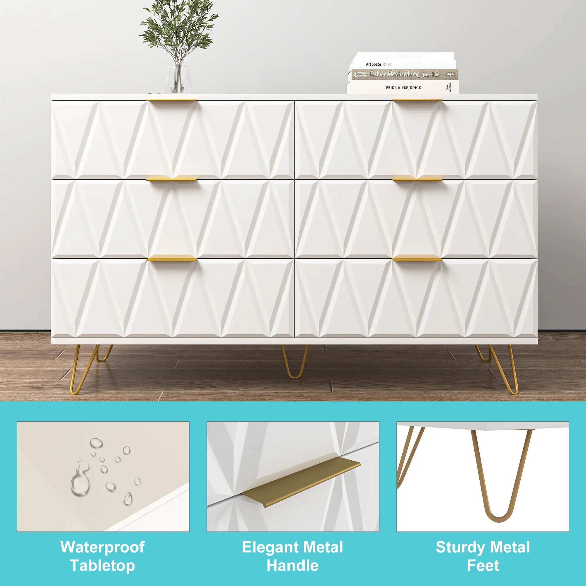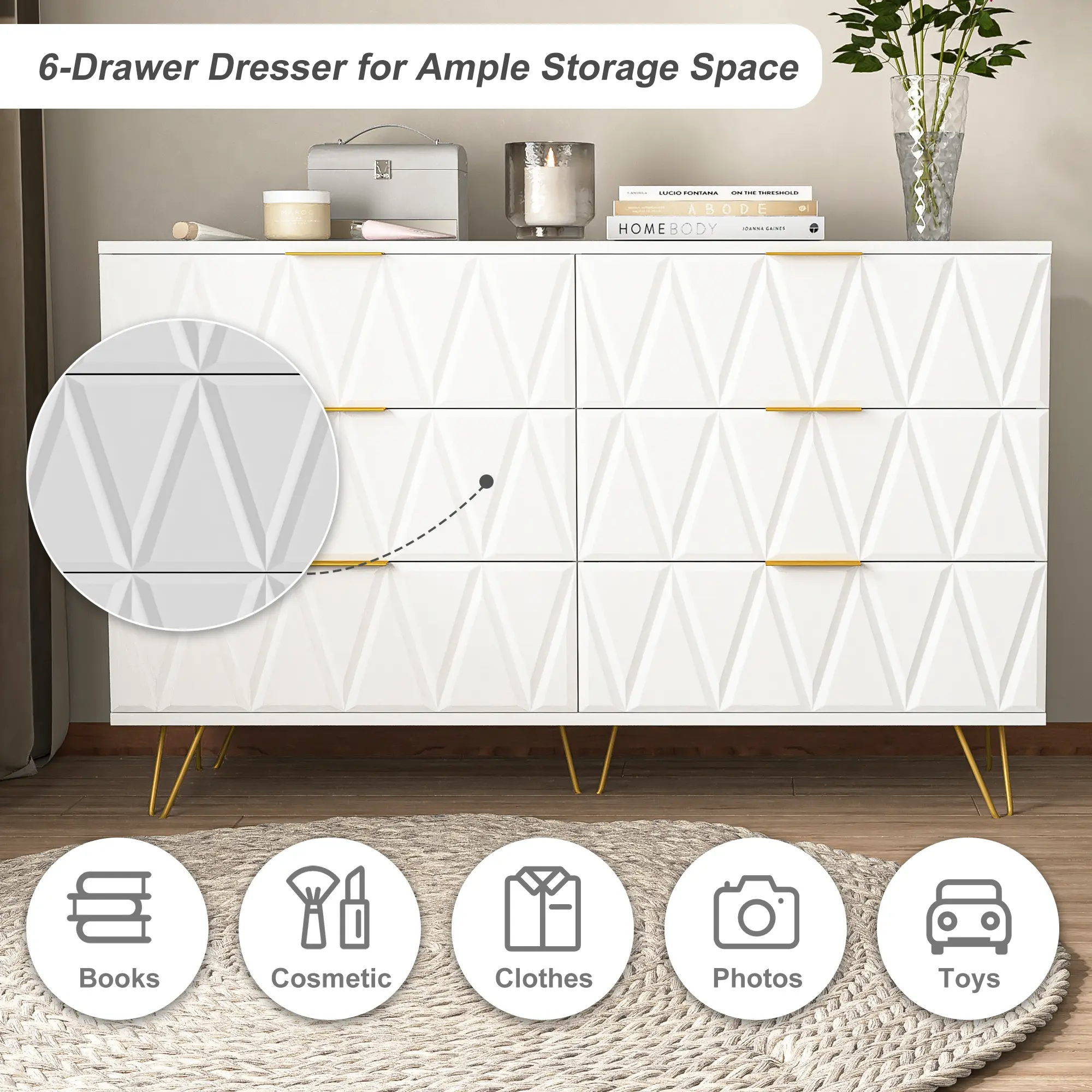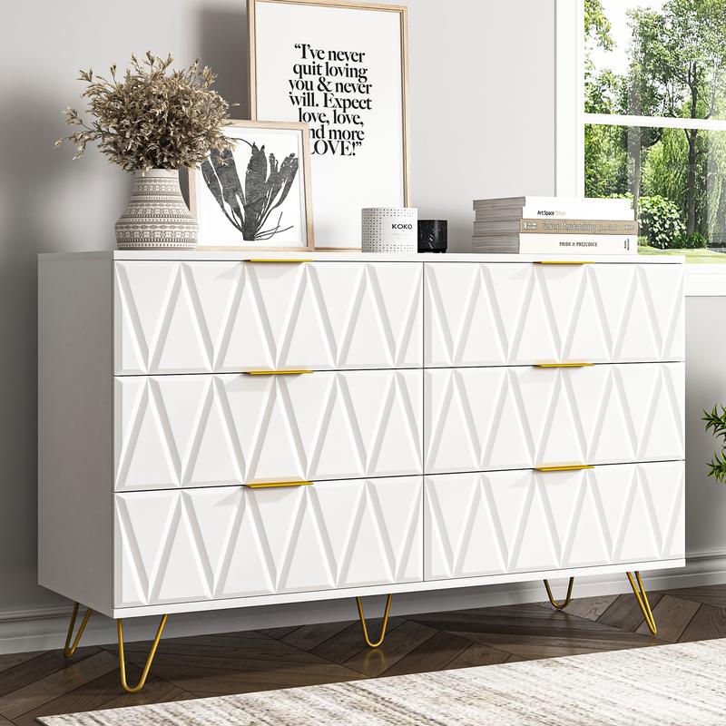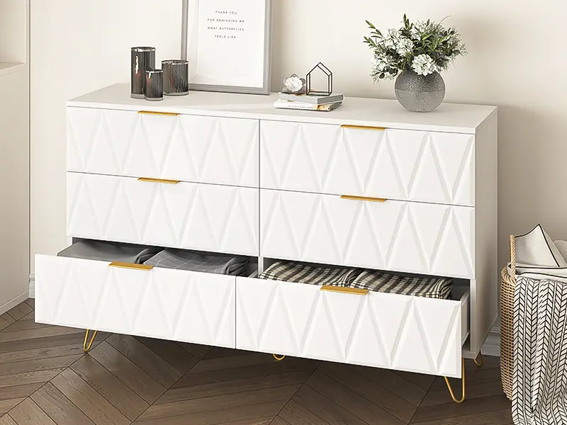 ·Six Drawers: This storage cabinet contains six drawers, each of which provides ample storage space for all kinds of items, from clothing and bedding to home decorations.