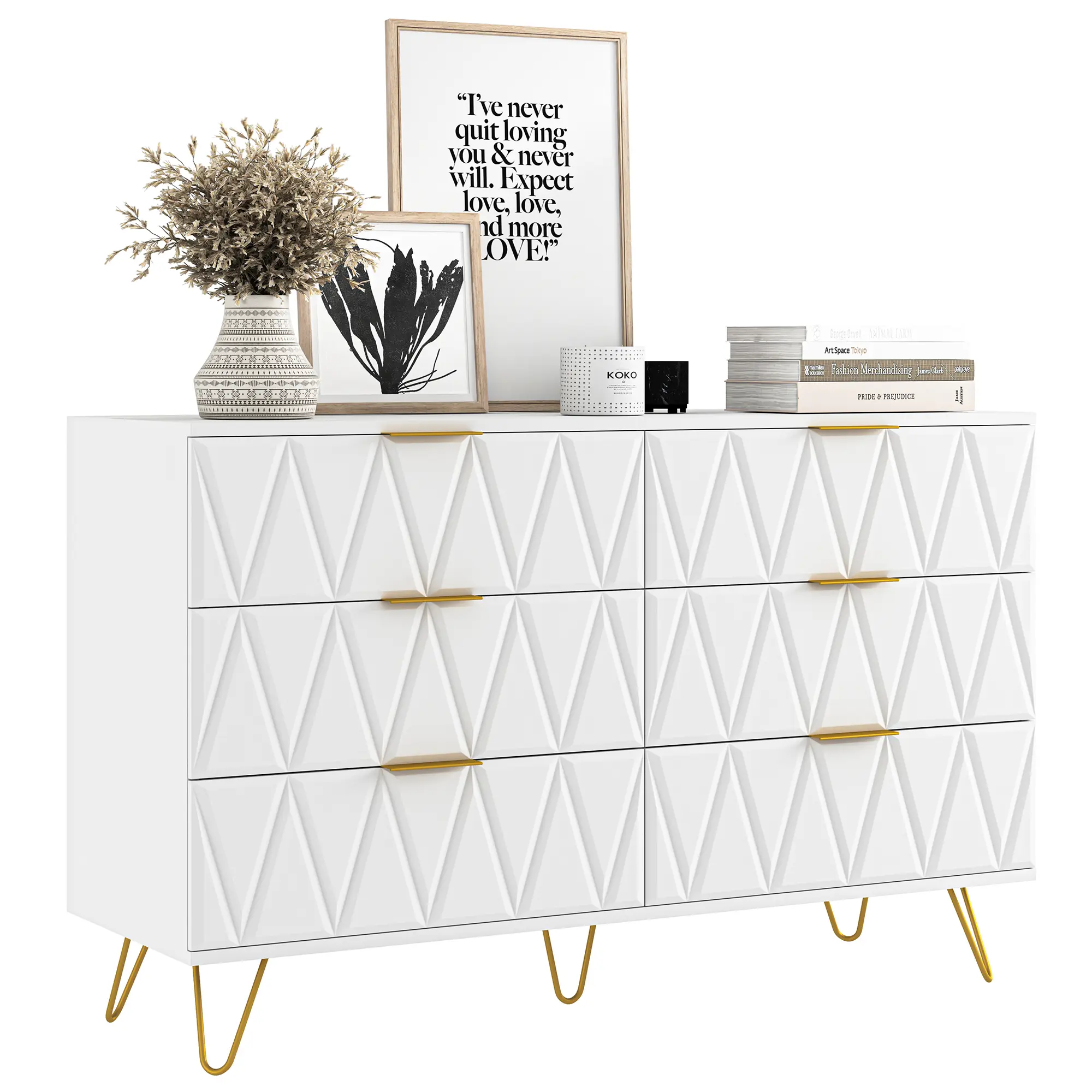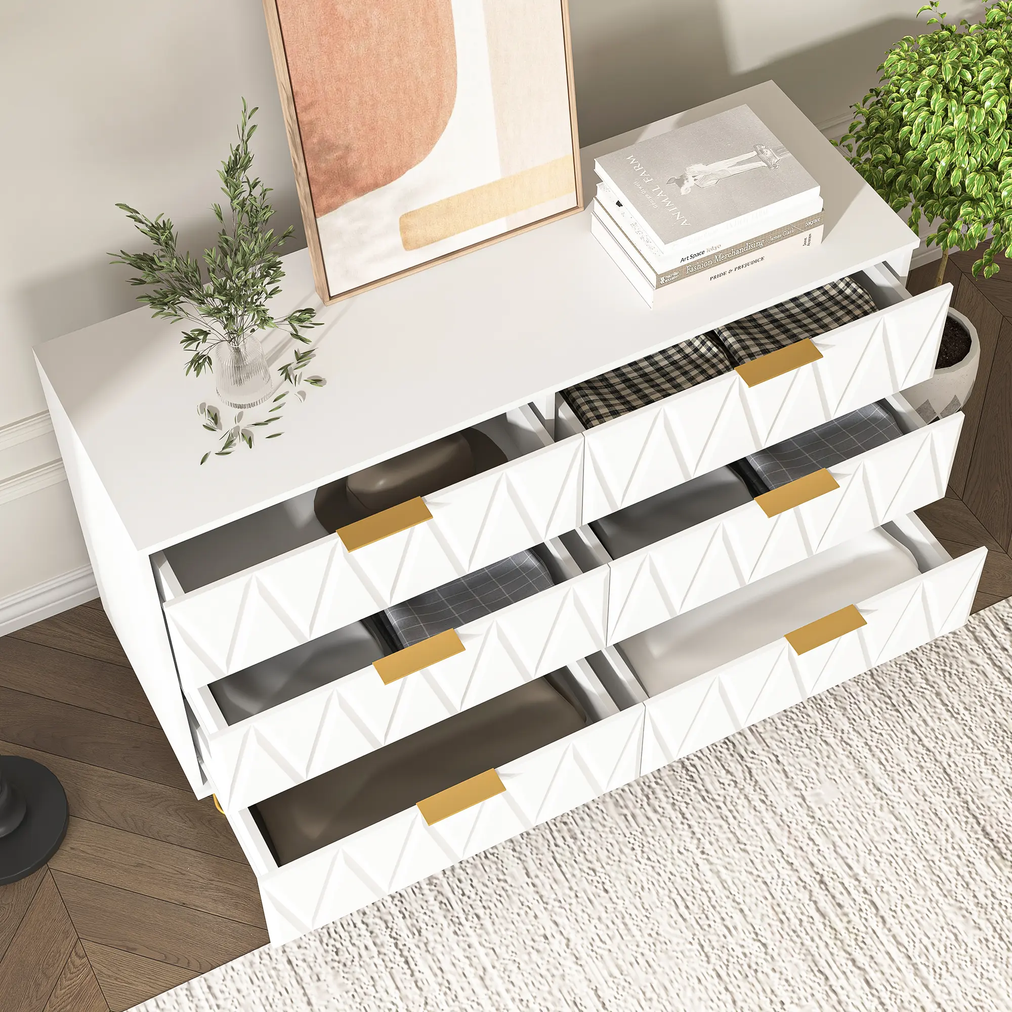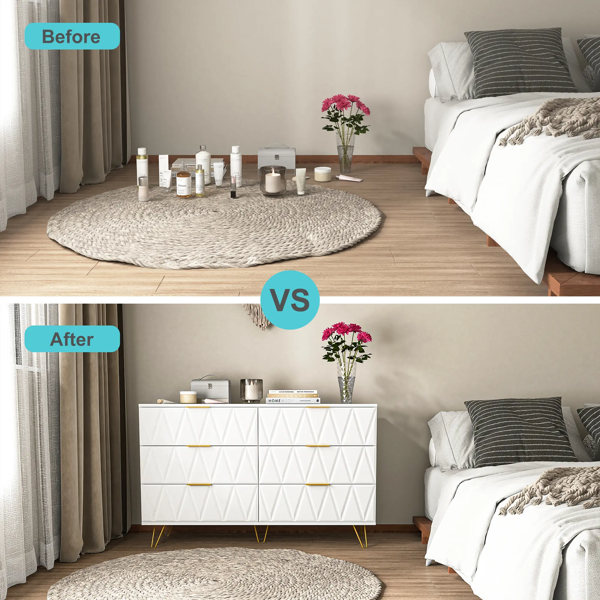·Six Drawers: This storage cabinet contains six drawers, each of which provides ample storage space for all kinds of items, from clothing and bedding to home decorations.