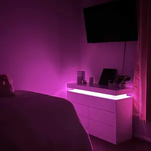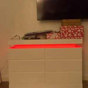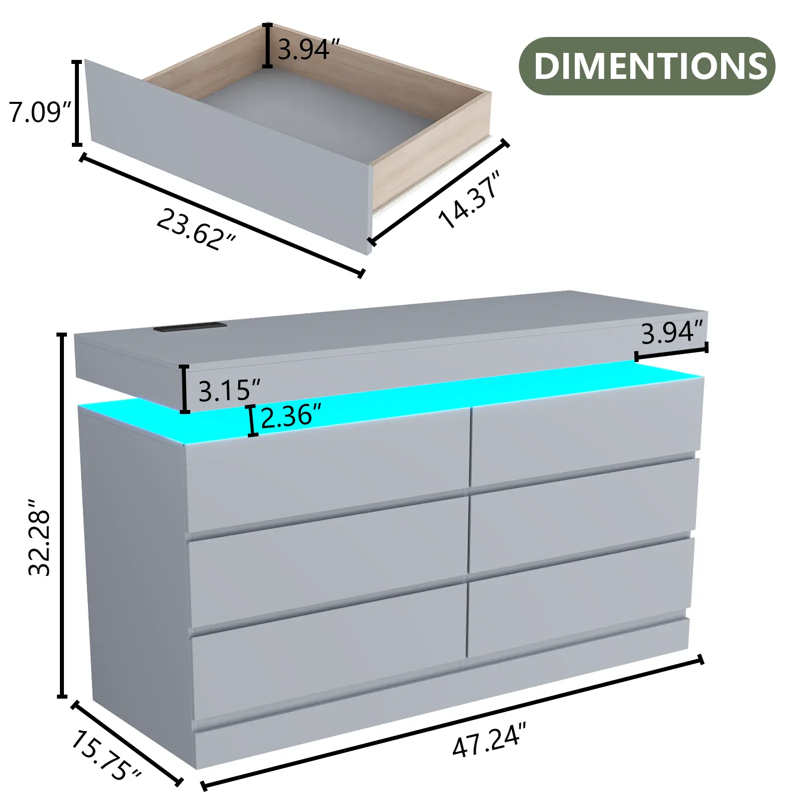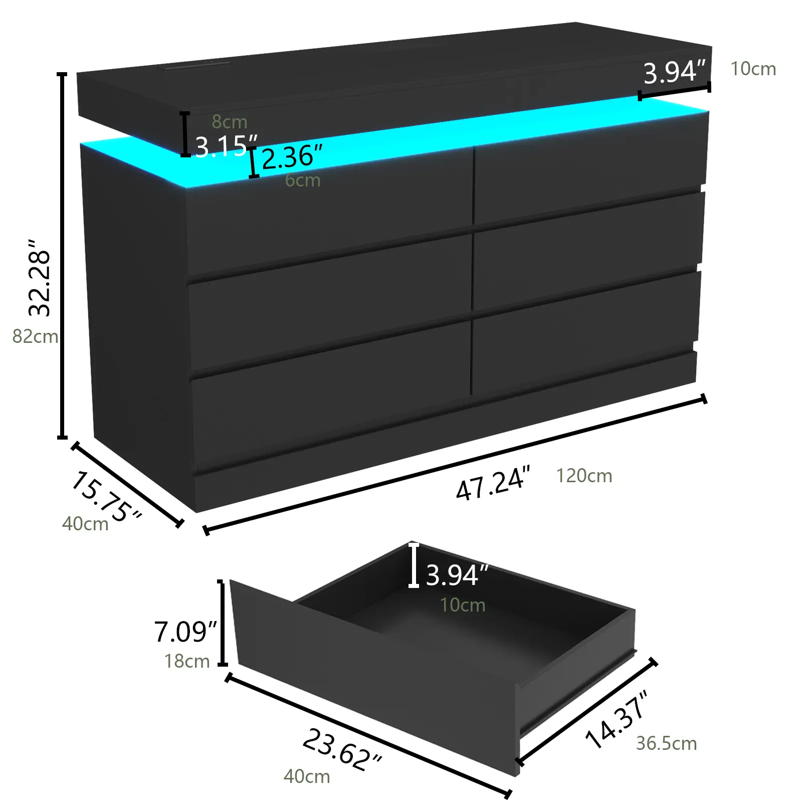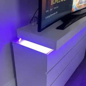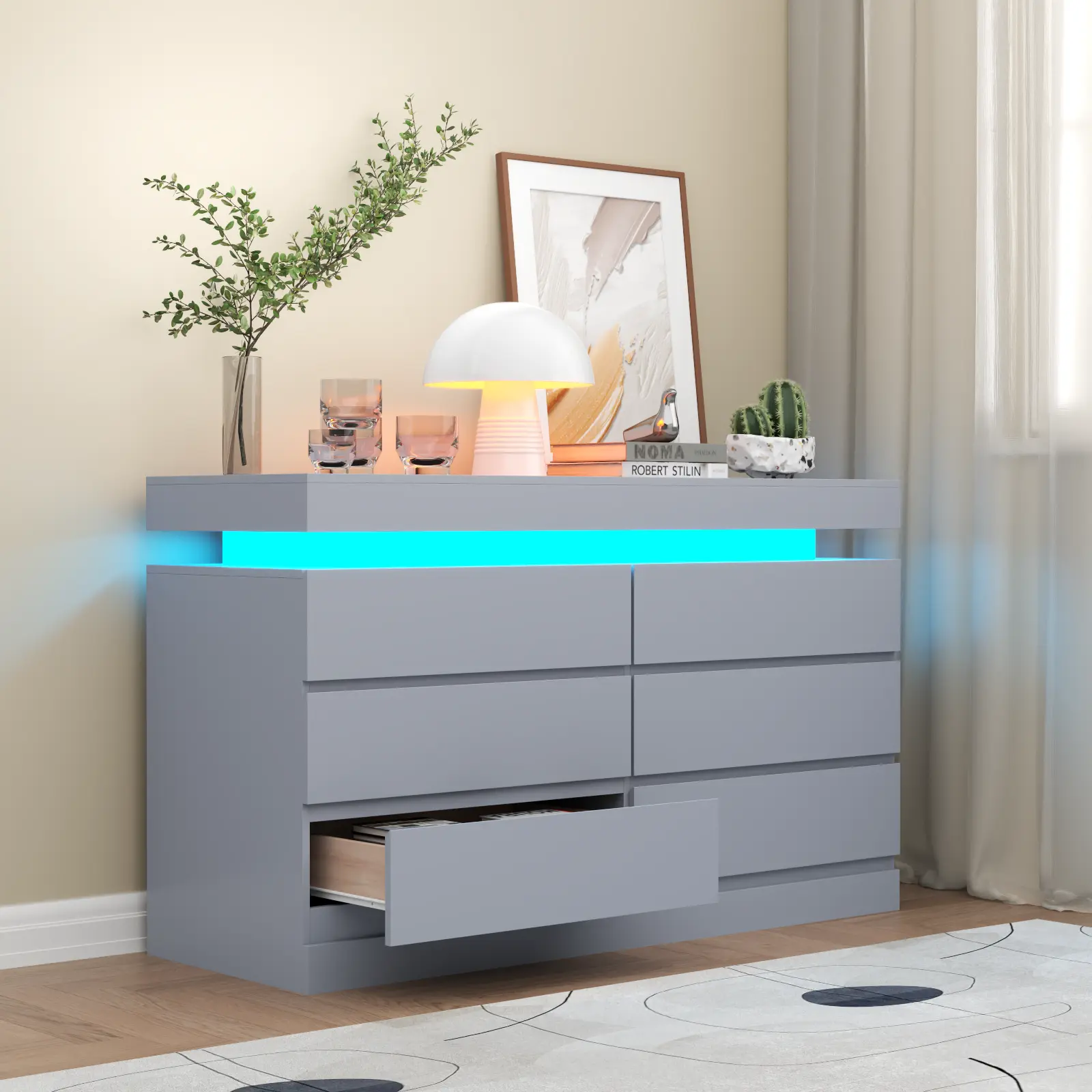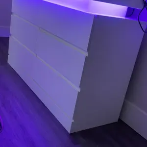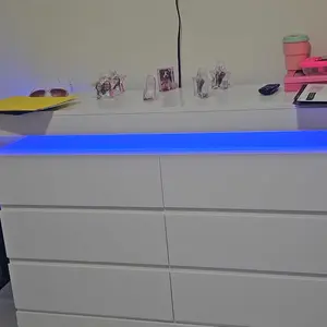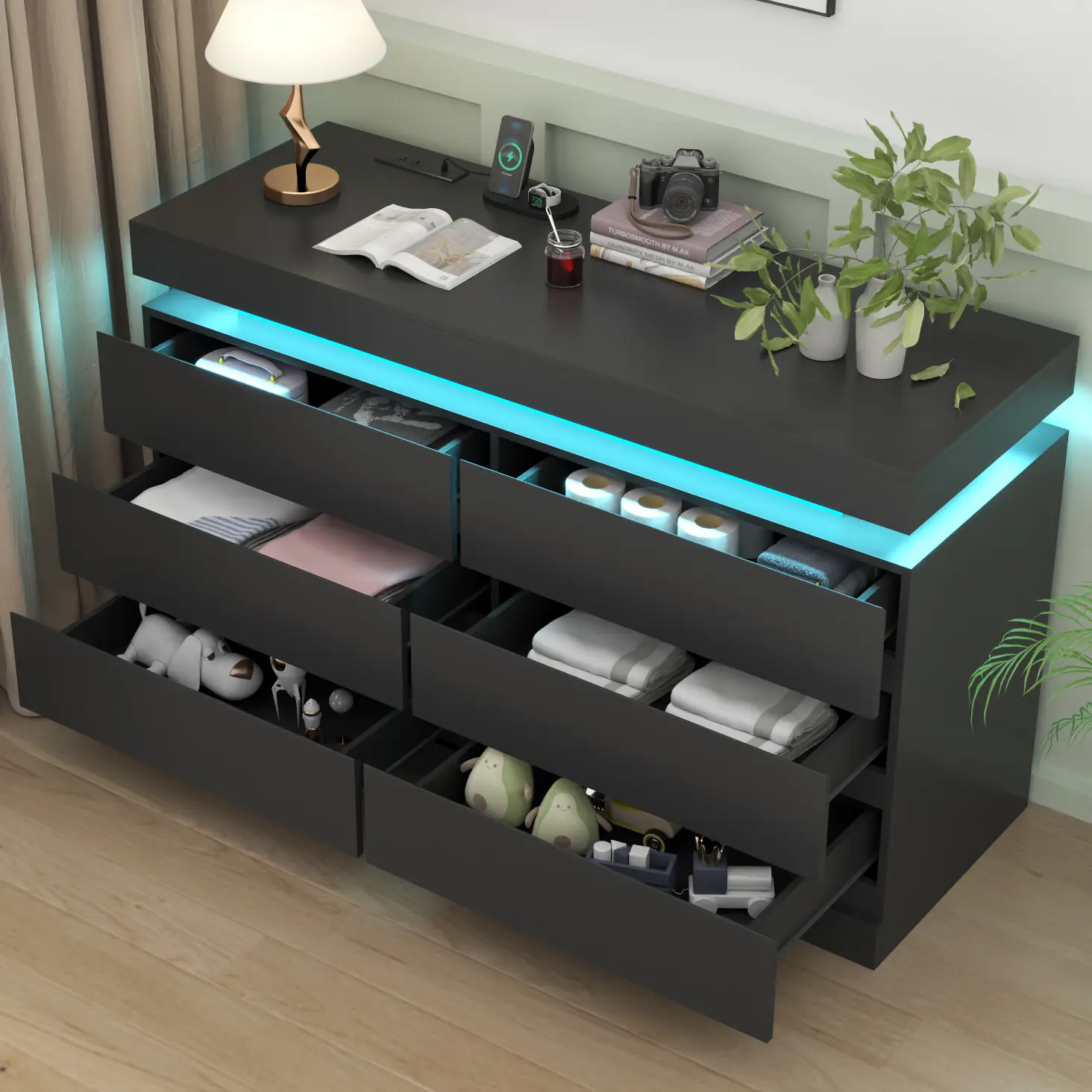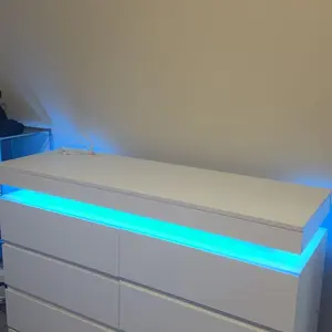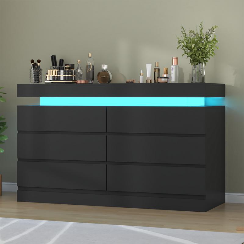 Dresser with LED Lights: This drawer organizer comes with multi-color RGB LED light strips, allowing you to adjust the colors and brightness via a button or an app, adding a stylish and diverse touch to your furniture. The unique design of the dresser creates a visually appealing floating effect at the top, adding sophistication and a captivating ambiance to your space.