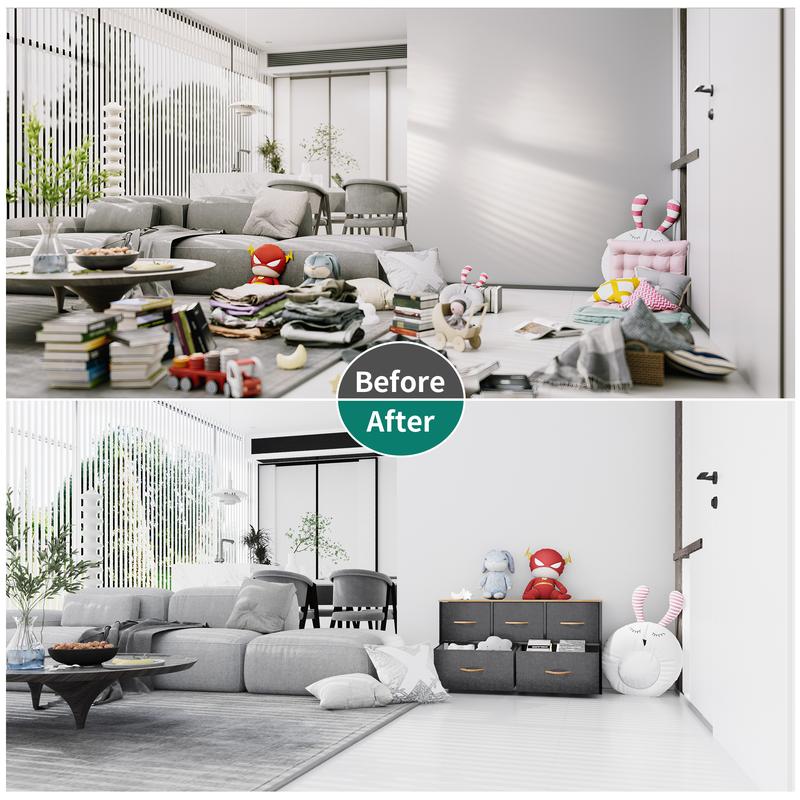 UNIVERSALLY COMPLEMENTARY- Premium black grey fabric drawers, with sturdy black metal frame and wooden tabletop; Enjoy modern scent and stylish aesthetics that easily complements various living spaces: living rooms, bedrooms, hallways, entryways, closets etc.