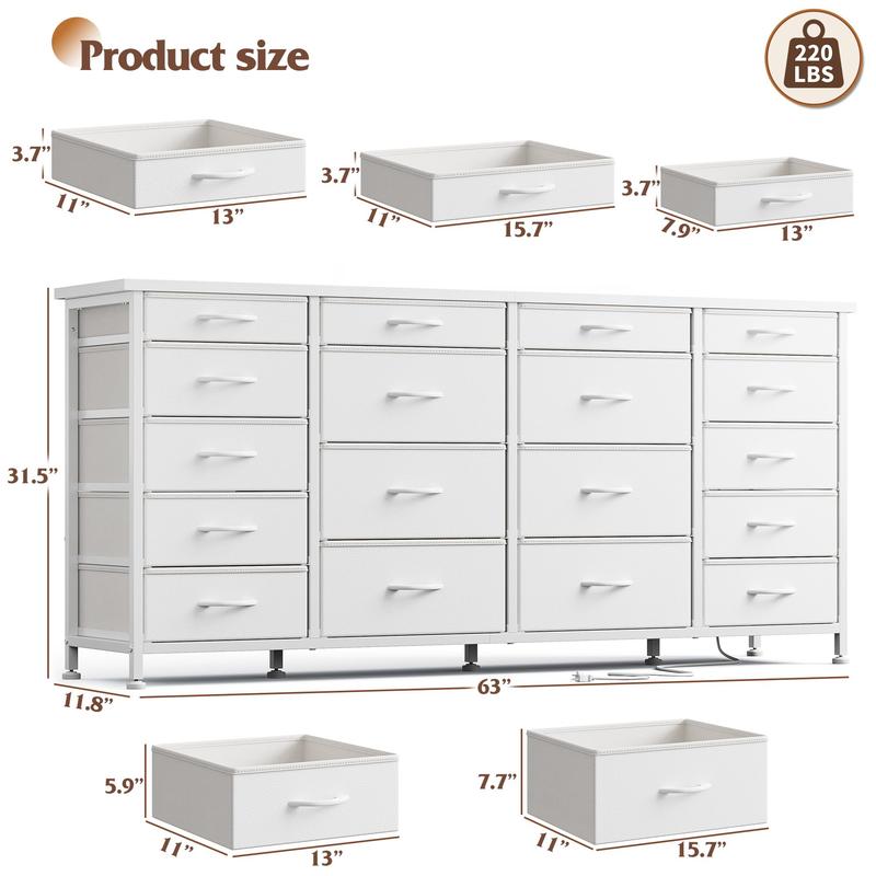 ·18 Drawers Dresser Provides Super Large Storage Space-Overall size: 63"W x 11.8"D x 31.5"H. A spacious desktop combined with 18 deep fabric drawers, which means this dresser for bedroom will bring ample storage space and multiple organised storage options. No more searching for lost clothes or digging through piles of clutter, each drawer provides ample space for your media collection, gaming accessories, clothes, bedding, and more