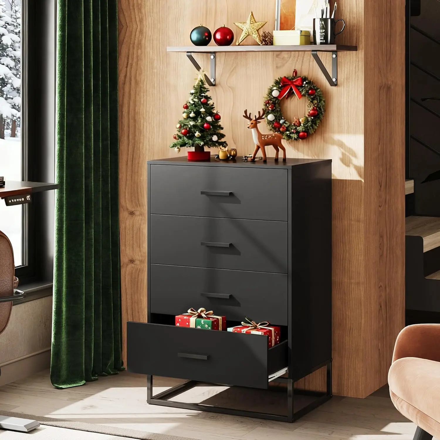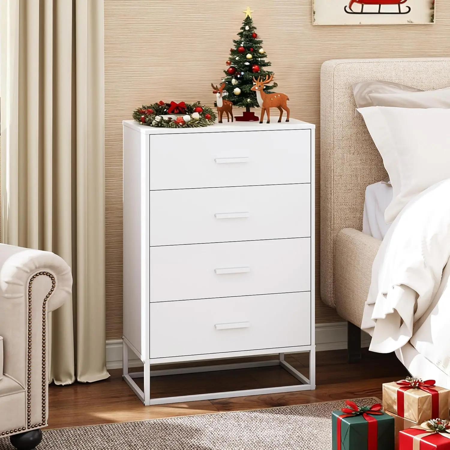 🎄【Modern Design】The wooden dresser with 4 drawers is very suitable for various occasions such as office, bedroom and kitchen. It can be used not only as a dress organizer/nightstand but also as an accent locker in the living room.