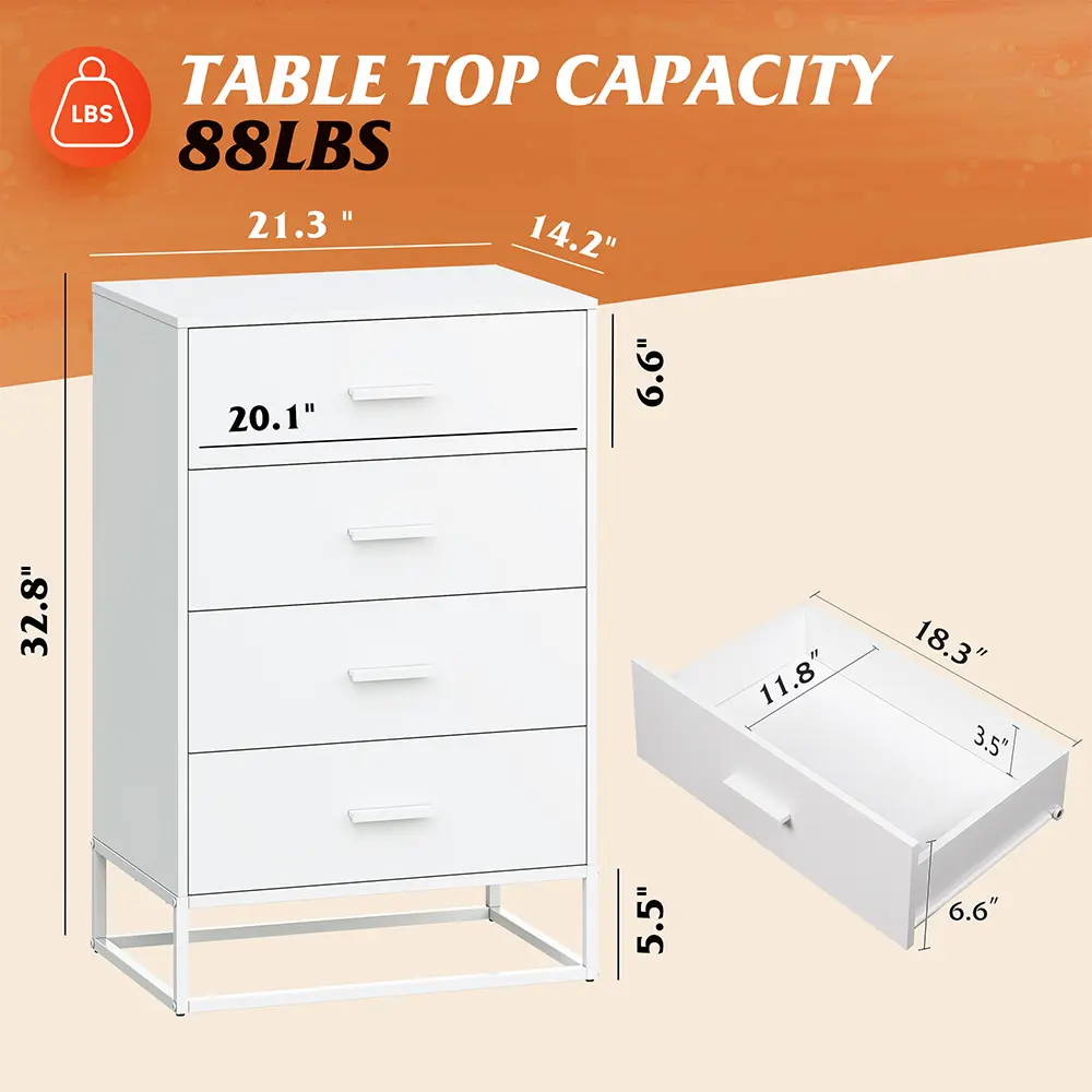 🏡【Large Storage Space】The bedroom dresser has 4 drawers, which can meet all your storage needs. They can be neatly placed inside to help you sort items by type, and keep all items and accessories in order, and you can save a lot of time when picking up items. The wooden top can withstand up to 88 pounds, providing a hard surface for placing lamps, books, decorations, etc