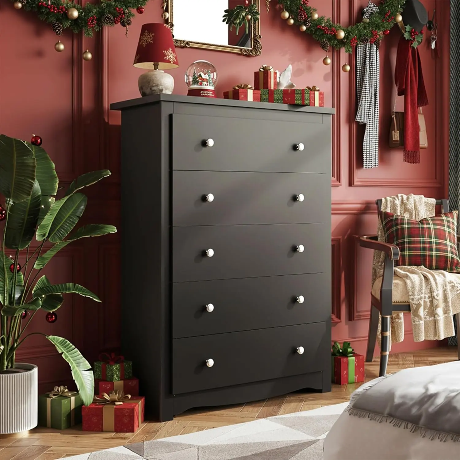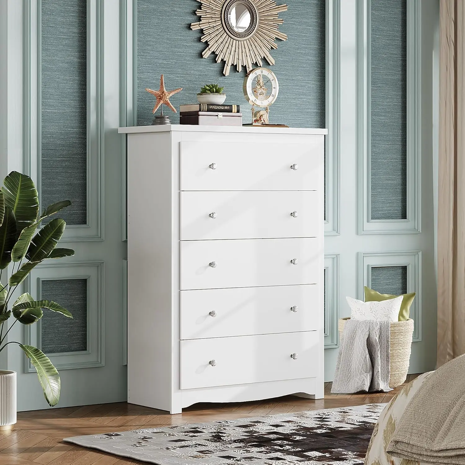 ·【Modern 5-Drawer Dresser for Bedrooms】This bedroom dresser size: 15.75"D x 31.50"W x 45.35"H, with 5 large drawers: 13.7"D x 27.7"W x 7.6"H. Additionally, our metal drawer slides glide smoothly, effectively preventing jamming or detachment. Each drawer supports up to 22 lbs and the thickened tabletop can support up to 66 lbs.
