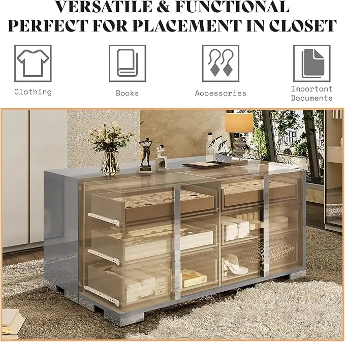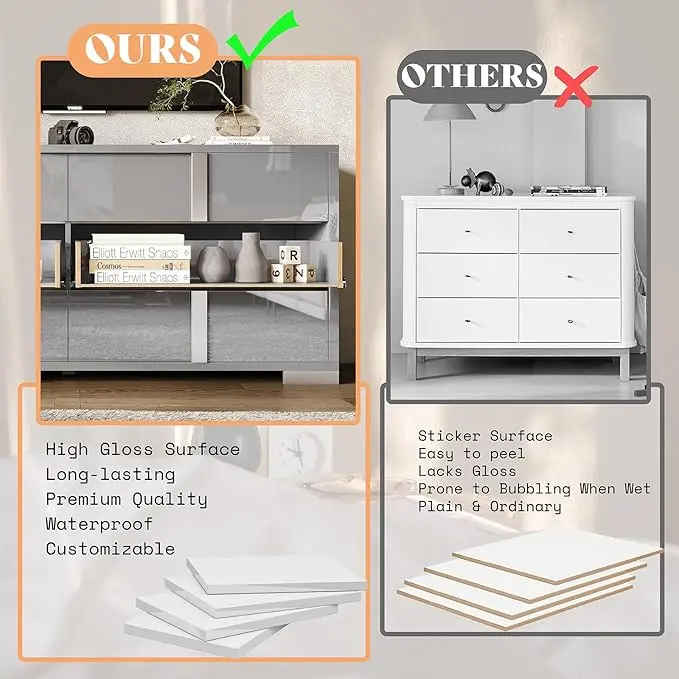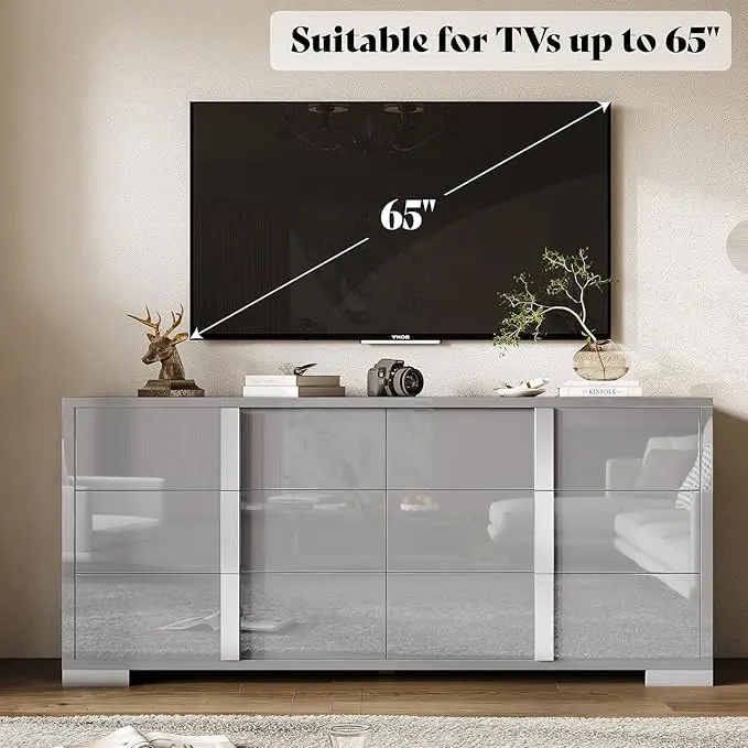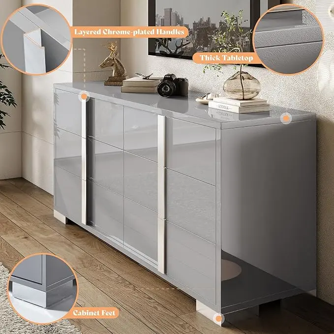 ·[Modern High Gloss] 6 Drawers Dressers boast high gloss surface with silver grooved handles and unique cabinet feet, adding depth and texture to its appearance. Easy to clean and maintain for a lasting shine