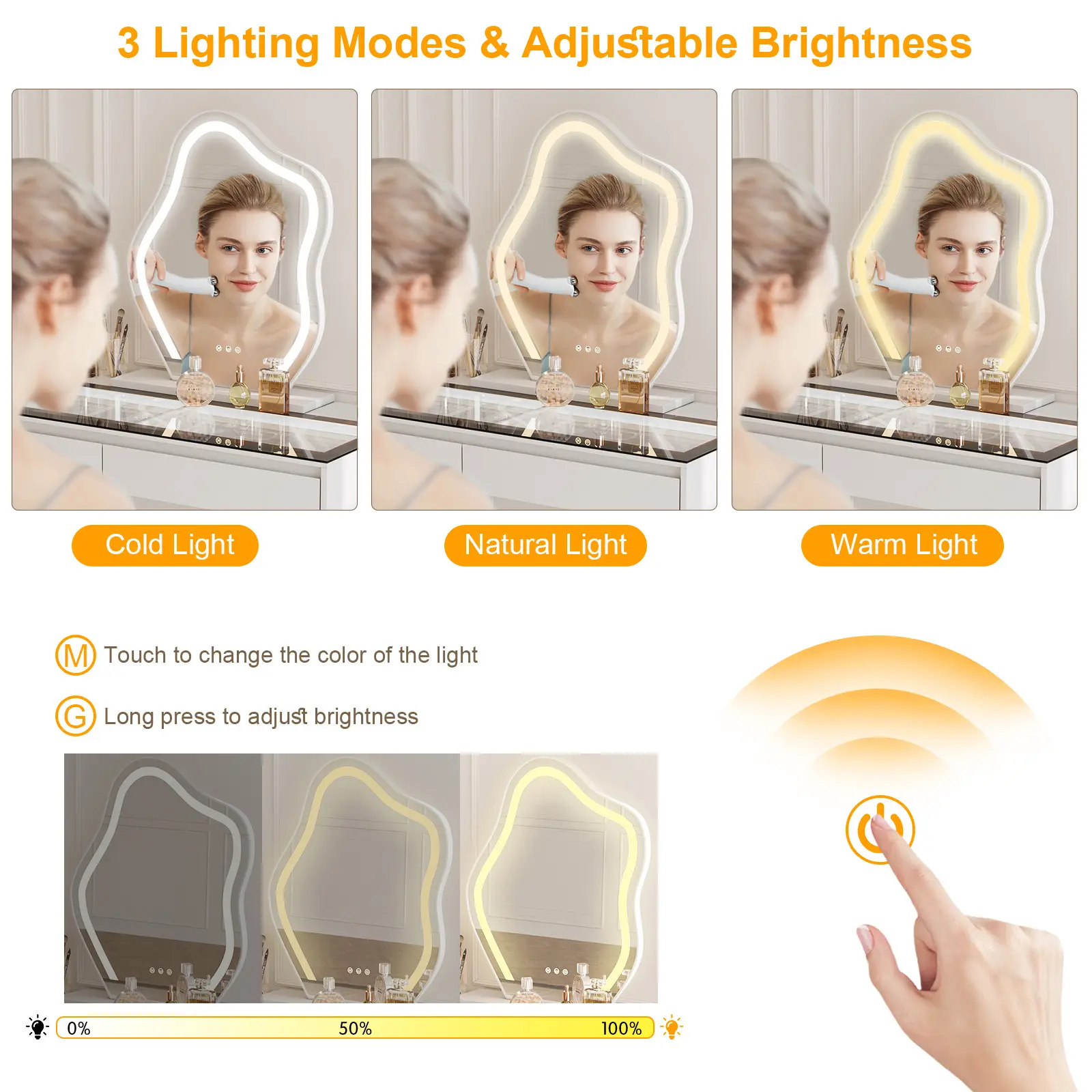 This makeup table is equipped with a mirror with lights, featuring 3 different lighting modes, including natural light, warm light, and cool light. The brightness adjustment range is from 0 to 100%. It can provide you with perfect makeup lighting effects at any time and any place.