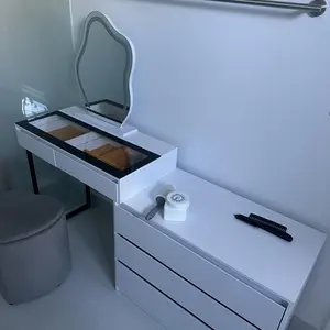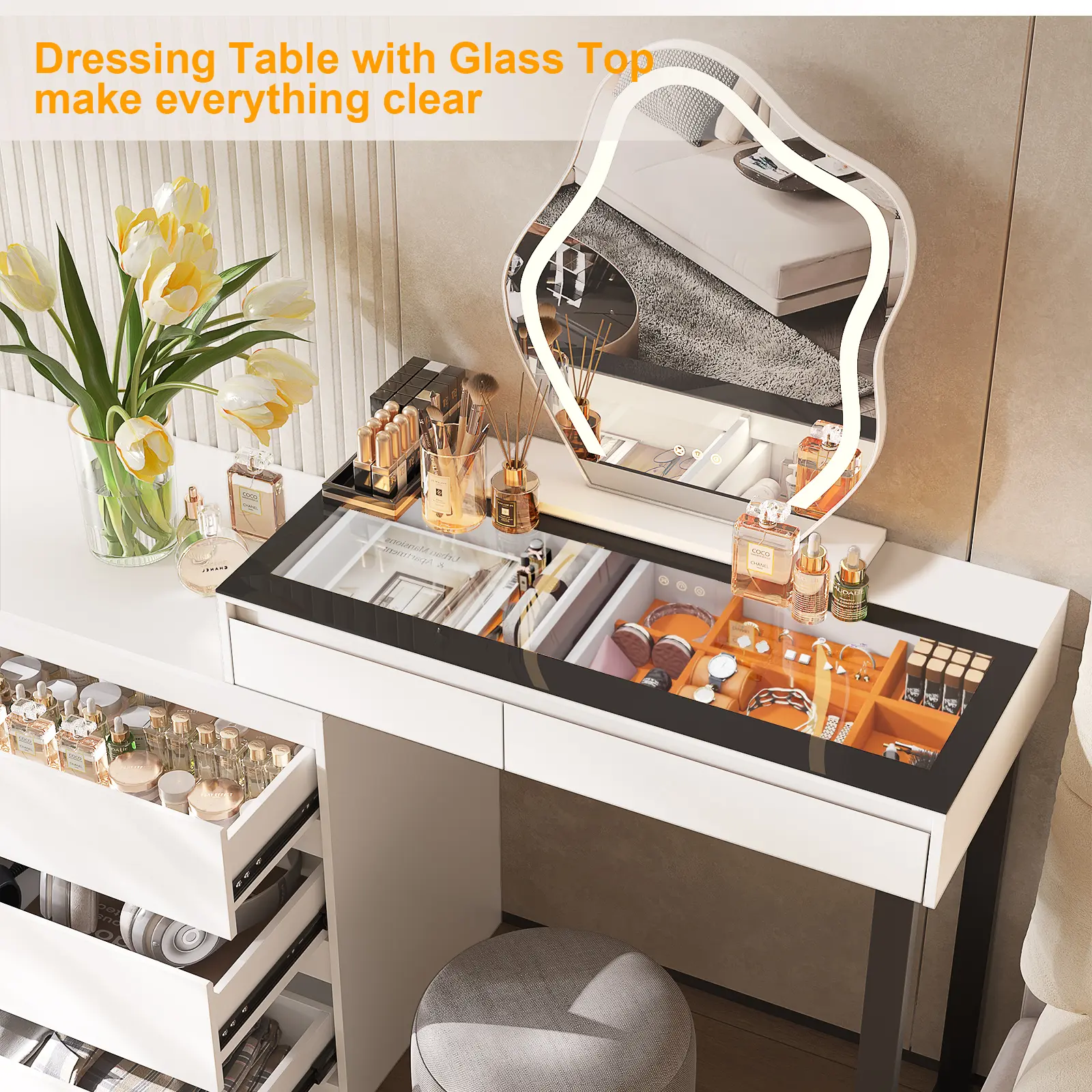 A 62.5-inch makeup table, with a transparent glass tabletop, can be used to display and store various cosmetics, perfumes, makeup brushes, hair dryers, blow dryers, jewelry, etc.