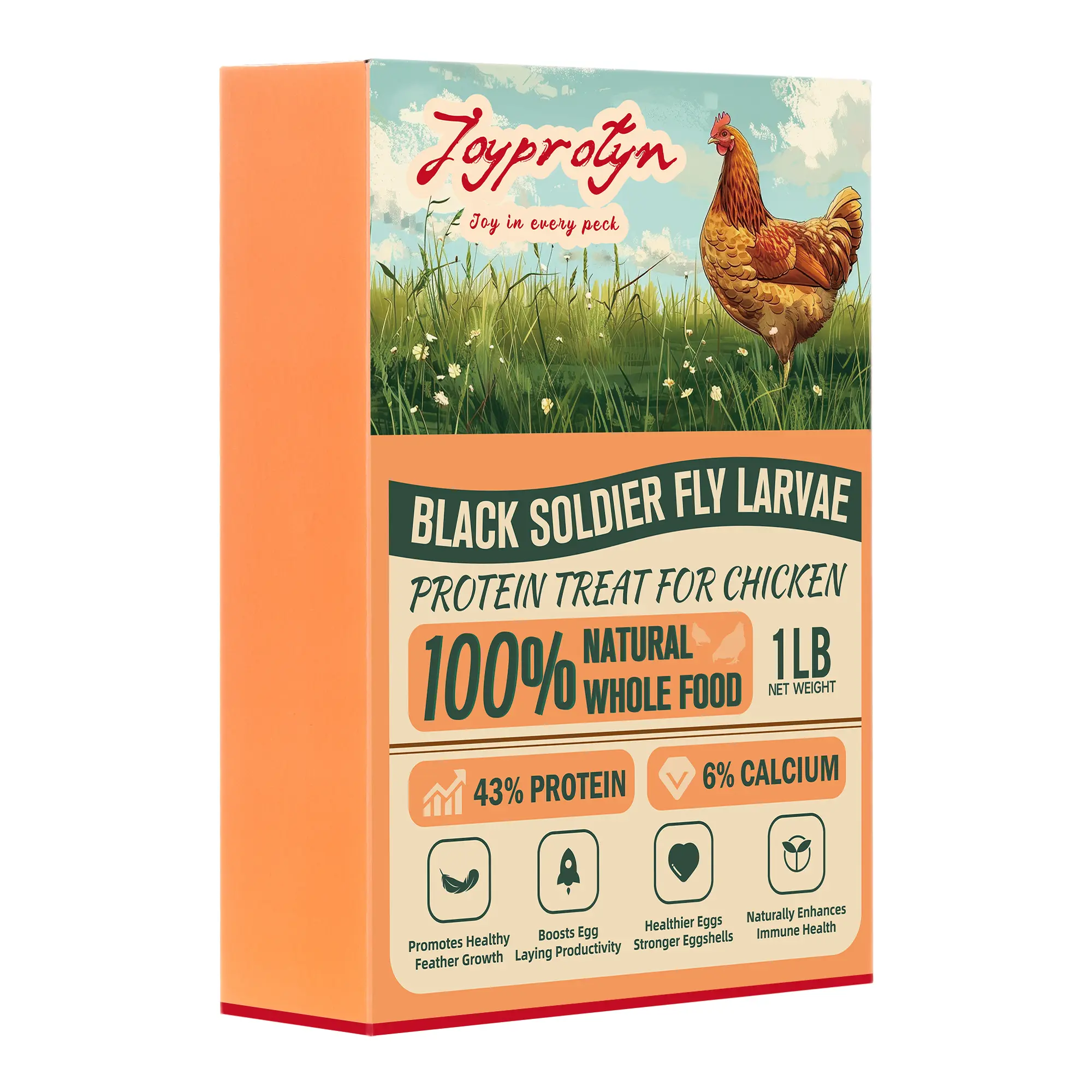Joyprotyn BSFL contains 43% protein, twice the typical chicken feed. This nutrient boost promotes muscle and feather development. It helps hens produce more high-quality eggs during their laying cycle. The protein source ensures vibrant plumage during molting.