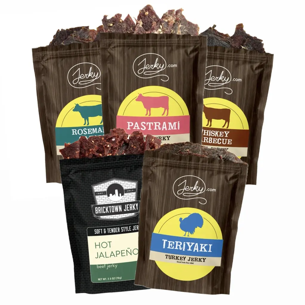 Indulge in our Staff Picks 5 Pack Bundle #1 - a delicious selection of dried meat snacks featuring Rosemary Garlic Beef, Pastrami Beef, Special BBQ Beef, Soft Hot Jalapeno Beef, and Teriyaki Turkey.