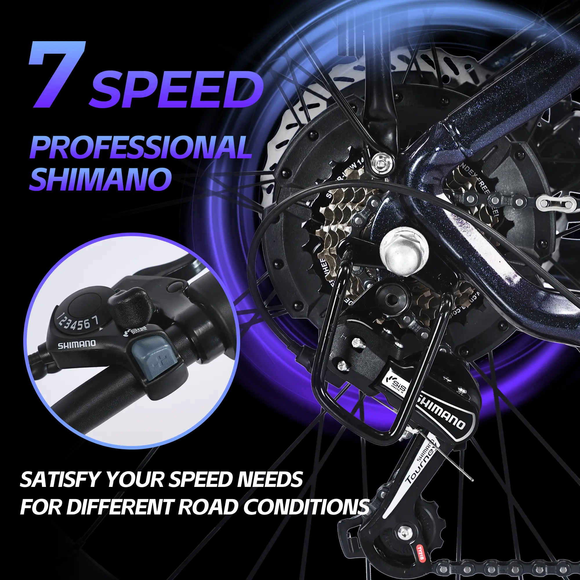 ·7-Speed Transmission: Features a 7-speed gear system for versatile riding options.
