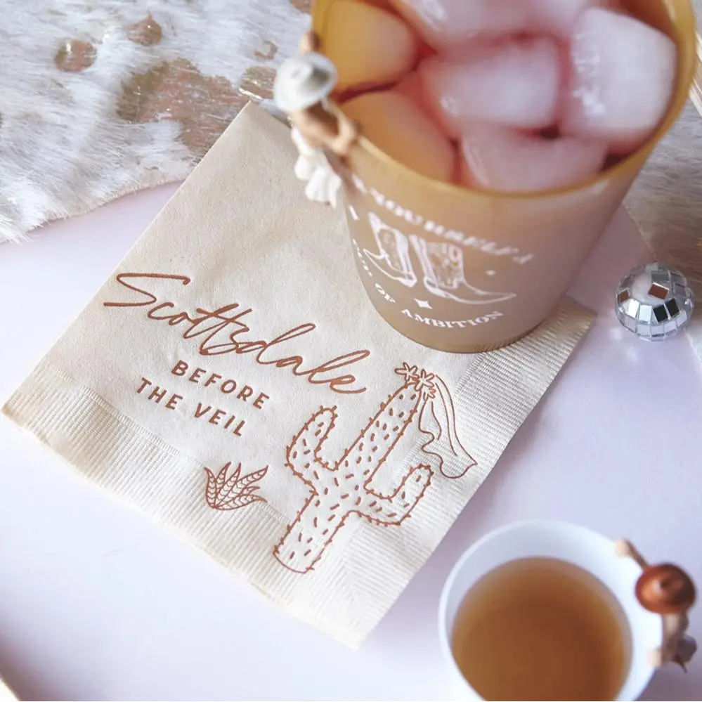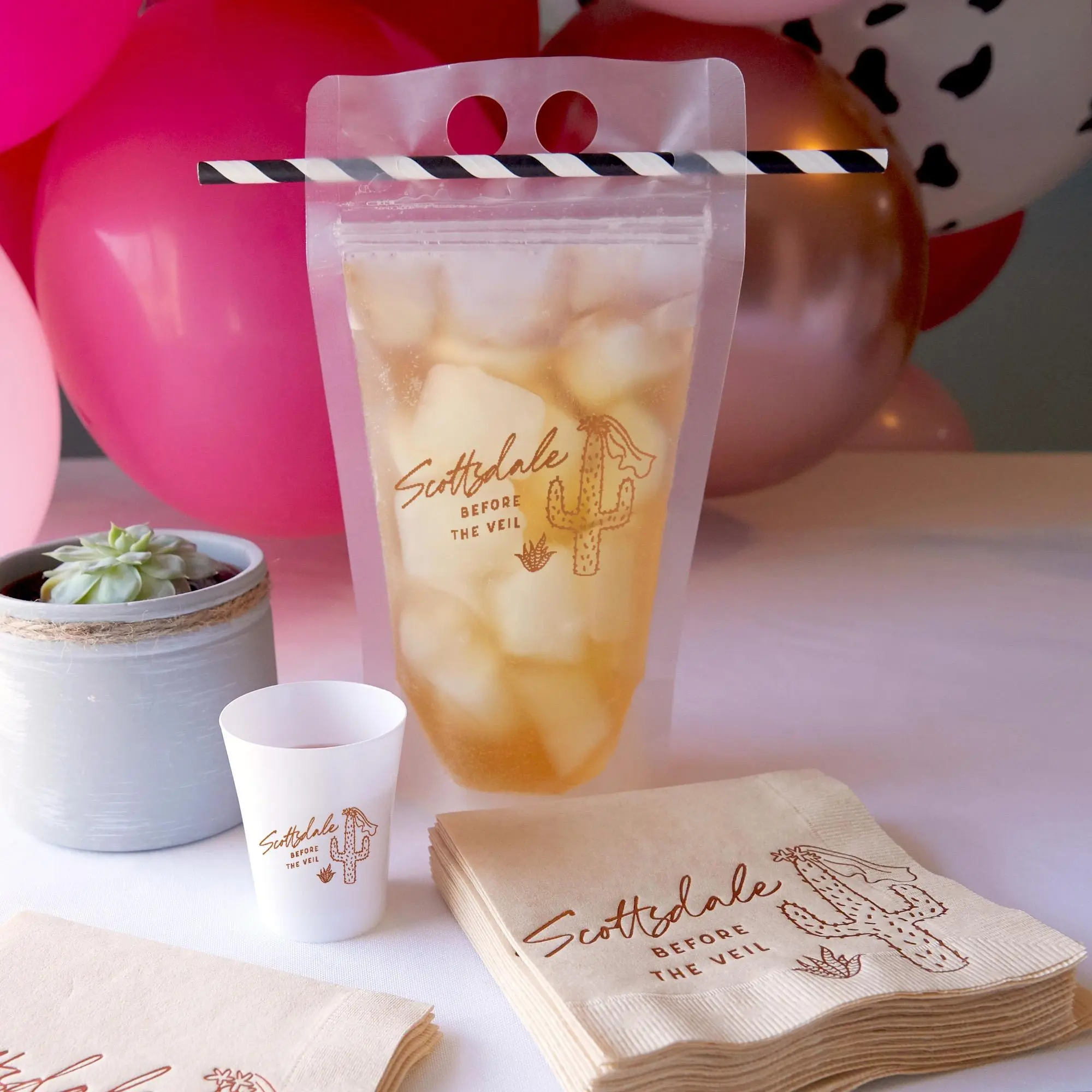 These Bachelorette Party Adult Drink Pouches are the perfect addition to any Scottsdale or Desert Cowgirl themed party! The pack of 12, 16oz Drink Pouches will make sure everyone has a drink in hand while celebrating. These Adult Drink Pouches are not only stylish and fun, Add a unique, creative touch to your event with party ready drink pouches. Printed with a fun "Scottsdale Before the Veil" graphic in goild foil, these plastic, reusable party bags will be the perfect complement to your Nashville Bachelor/Bachelorette party or Birthday trip. Get yours today for those last minute, fun party details that really make your event special. The Scottsdale Before the Veil Drink Pouch set includes 12 pouches with a foil stamped design. PRODUCT DESCRIPTION Pack of 12, 16oz Drink Pouch 8.25" tall, 4.875" wide. Base expands to about 2.5" when full 4.0 mil recyclable PET plastic reusable and resealable with zipper closure 2 larger finger holes at top for carrying 2 smaller holes for straw Perfect for a bachelorette party, wedding celebration, birthday bash or any festive occasion! These Glam themed party decorations will surely make the event more memorable. Don't settle for plain and boring cups when you can have these cute and festive ones to match your theme. Order now and get ready to celebrate the veil in Scottsdale with your girlfriends!