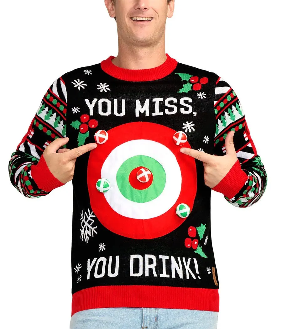 The men's drinking game ugly christmas sweater isn't just fun for the person wearing it, it's fun for the whole party! It comes with six velcro balls that will stick to the sweater when thrown. It also comes with a rule card that will lay down the law of the Tipsy Elves Drinking Game. The target is a decent size but as the game goes on, it will become increasingly hard to hit and hopefully that means everyone is having a blast! Check out the back of the sweater for a reminder of the rules and remember to drink responsibly. See how the Drinking Game Sweater works in the video!