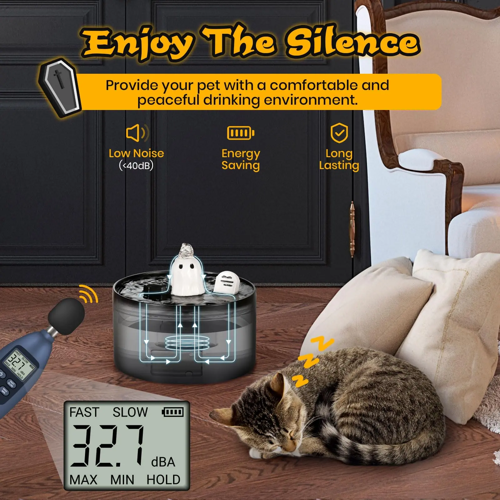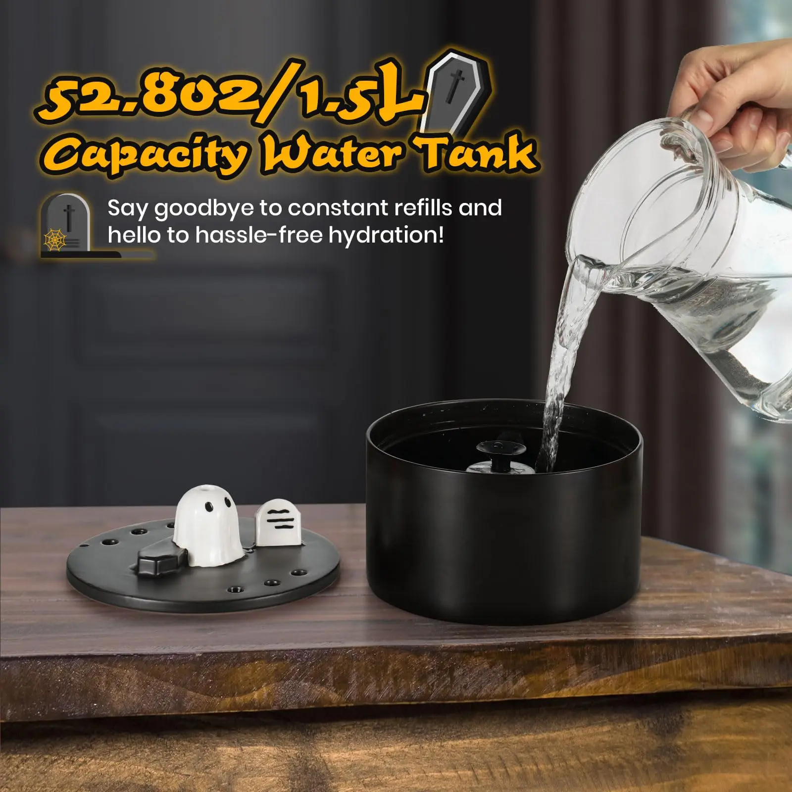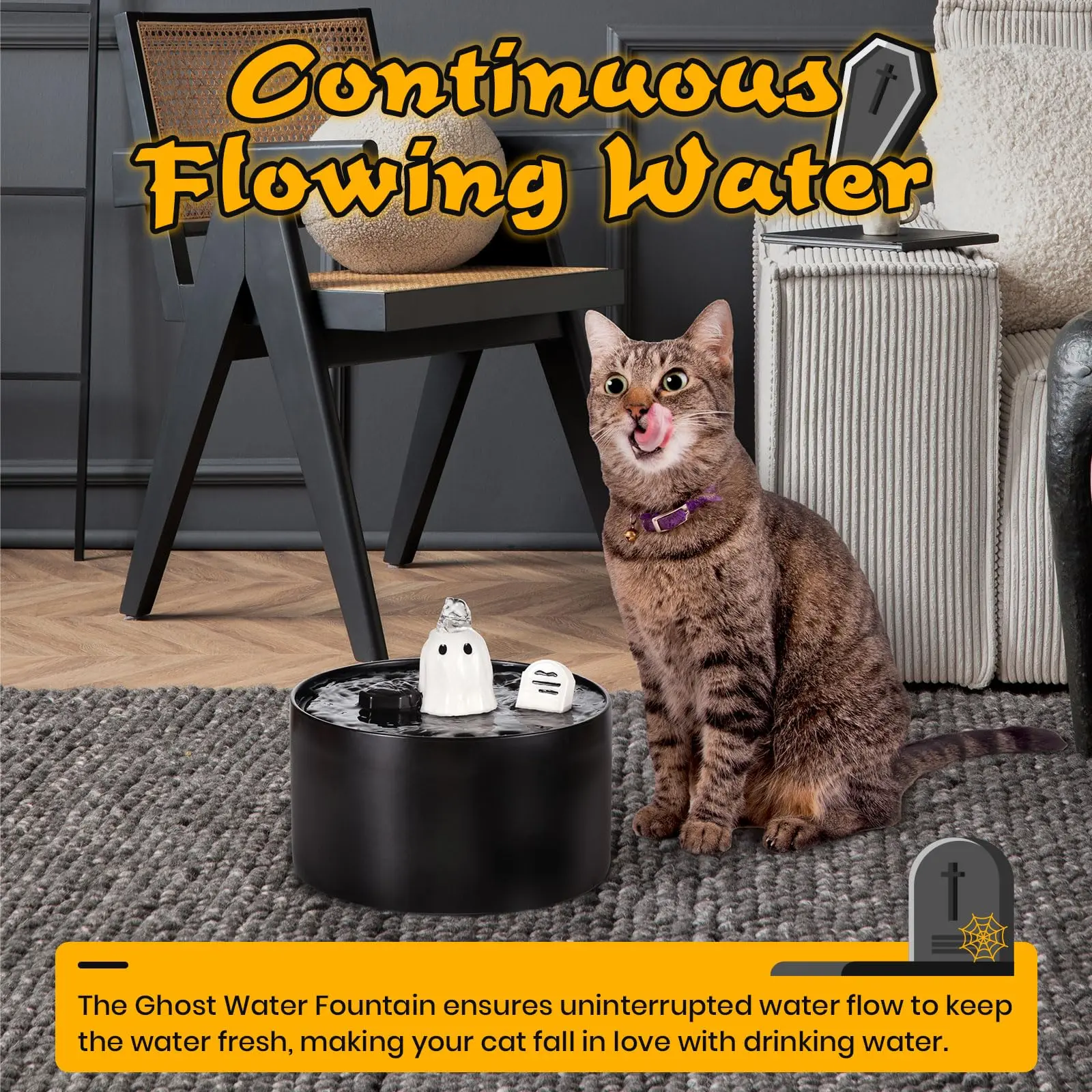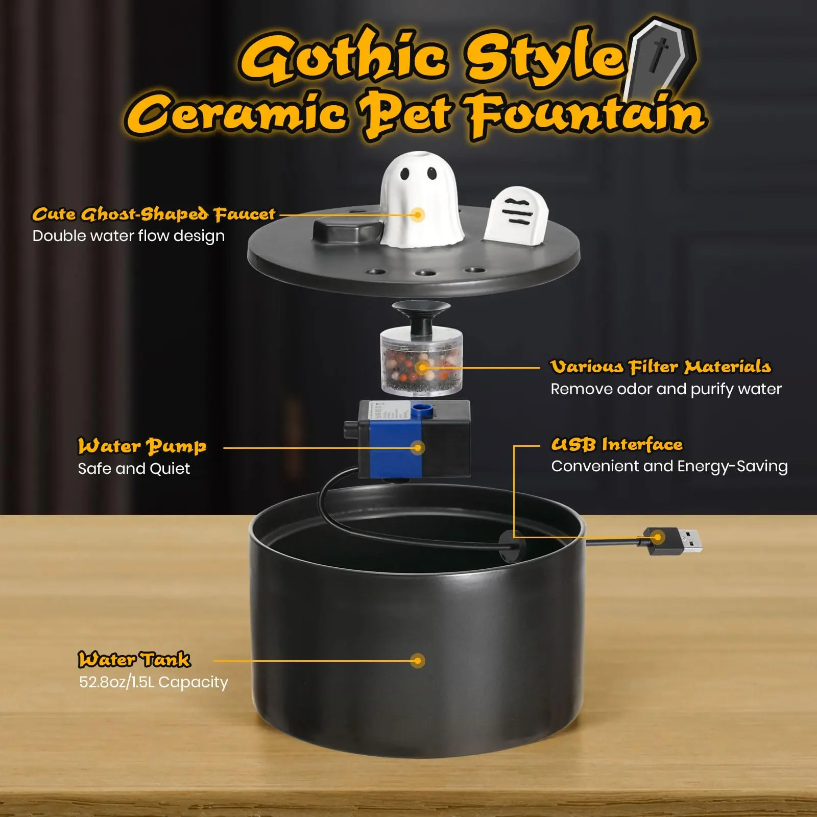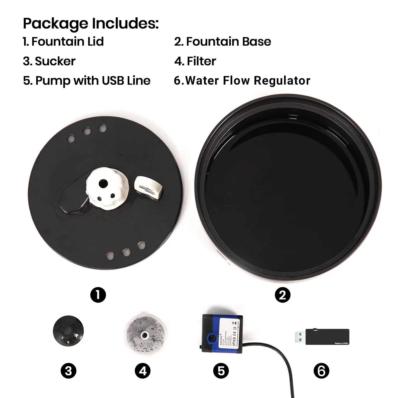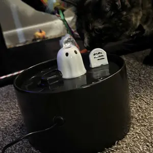 The package includes the Ghost Water Fountain, IPX-8 Submersible Pump with USB line, Filter*1, and Sucker*1, and Water Flow Regulator*1.