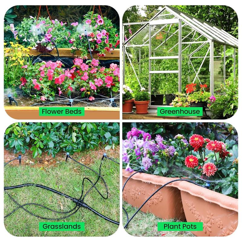 This kit includes three emitter types: micro-droplet mode, fine spray mode, and water-flow mode. You can fine-tune each spray nozzle’s output and pattern — ideal for different plant zones, raised beds, potted plants, and greenhouse racks.