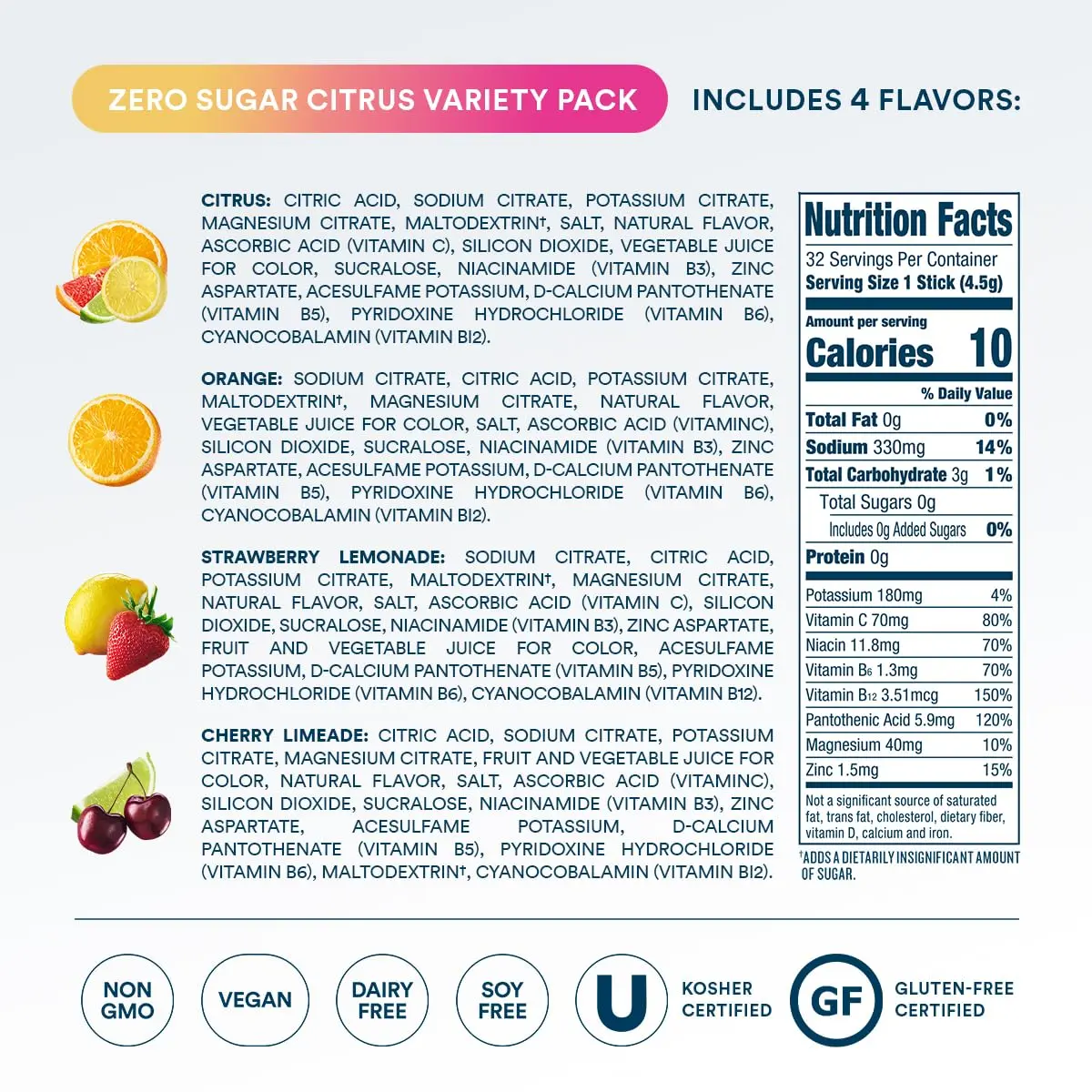 New delicious sugar-free 4 flavor variety pack: Citrus, Strawberry Lemonade, Orange and Cherry Limeade assortment.