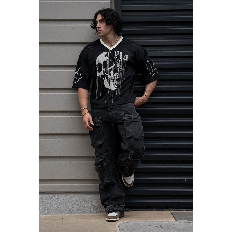 DESIGN: Step up your game with our modern-fit Football Jersey, designed for style and performance. Featuring a striking dripping skull print on the chest, this jersey exudes edgy appeal. The number 14 emblazoned on the sleeves adds a classic sporty touch. Perfect for both on and off the field, this jersey ensures you stay comfortable and fashionable.