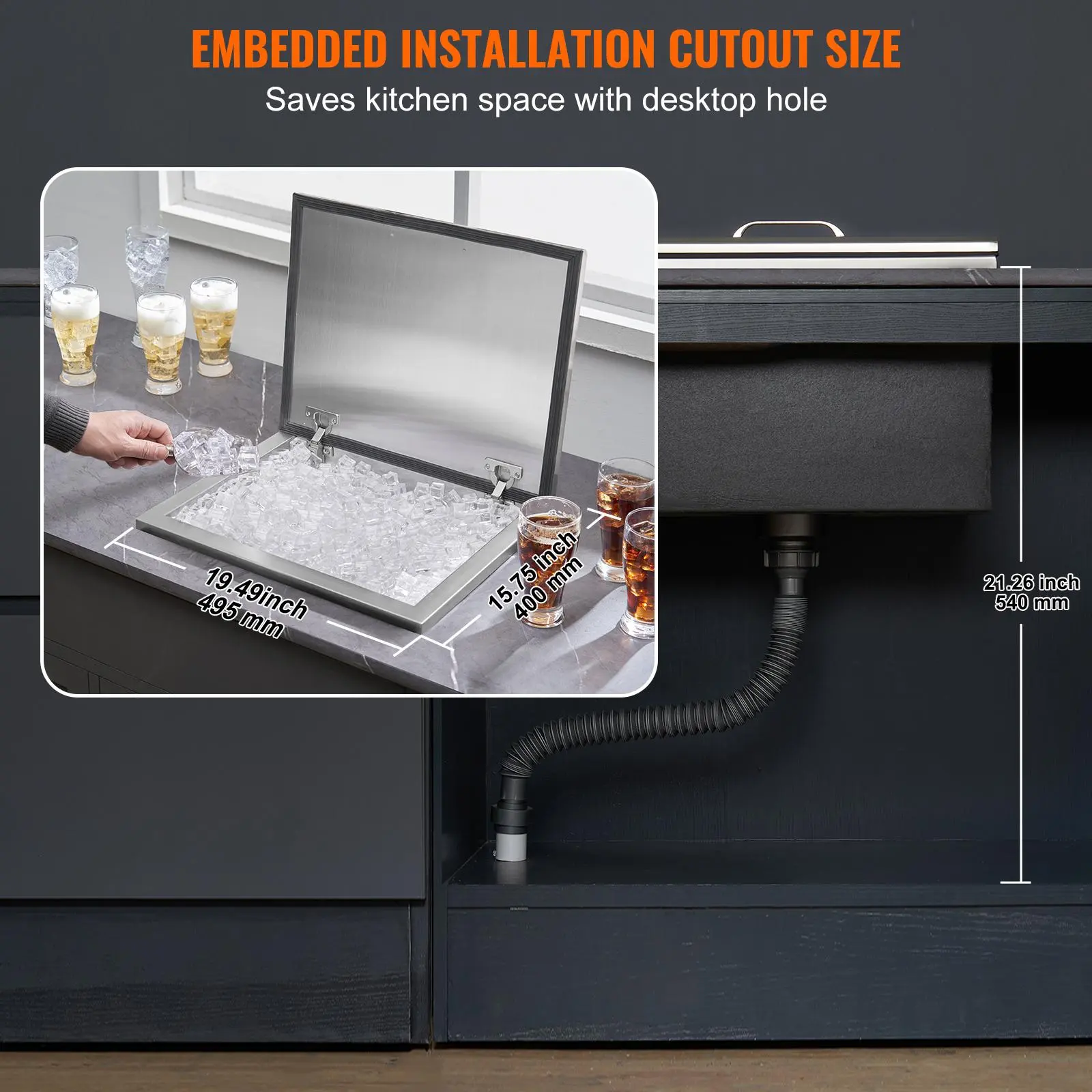 • Embedded Installation: The ice storage chest can be installed in beverage stores, hotels, or bar counters. Also suitable for indoor and outdoor kitchen counters. The embedded installation saves significant space.