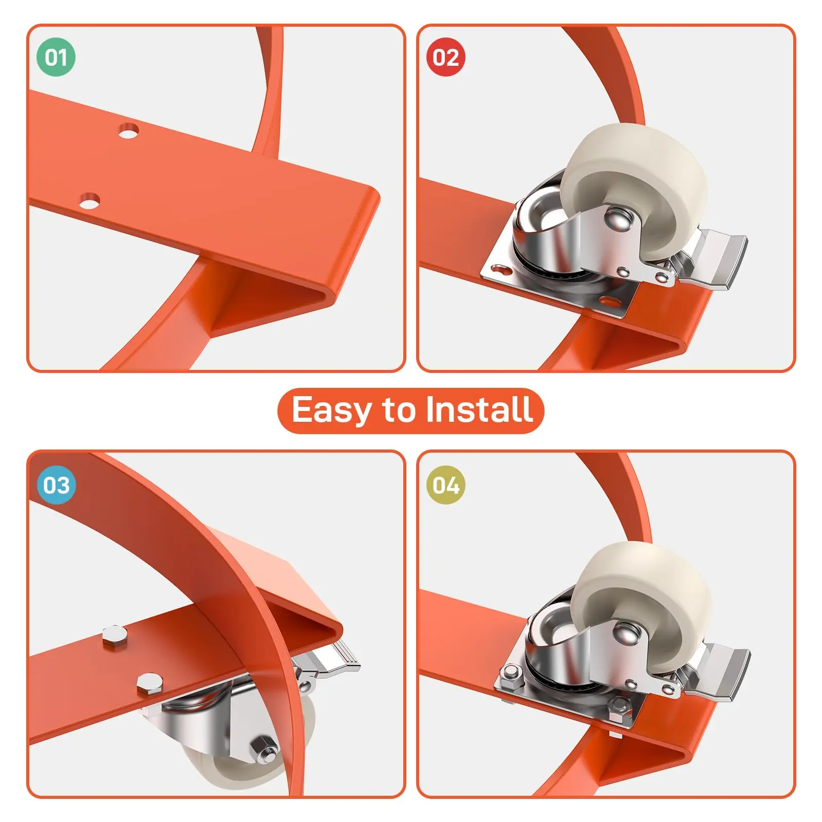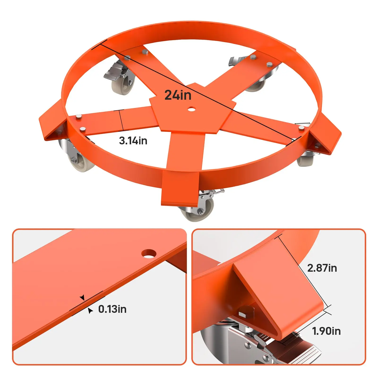 · [360° Rotation Wheel]:Five 360° swivel casters on the bottom of the frame make this heavy duty dolly easy to move around the warehouse or other job sites when loaded with 55-gallon drums or large trash cans.The wheels roll smoothly and don't get stuck, so you don't have to worry about the risk of tipping!