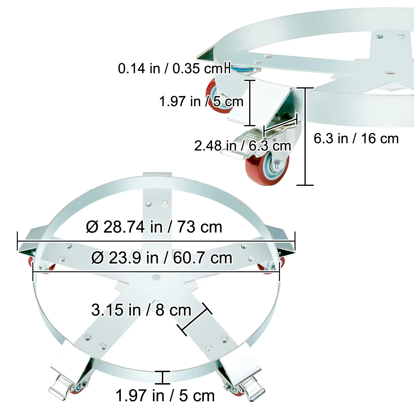 • Heavy-duty Steel Construction: 55 gallon drum dolly is constructed of high-quality carbon steel with a 0.14 in / 3.5 mm thickened frame for rugged durability. The galvanized finish for corrosion resistance and cross strap design avoids warping or tipping.