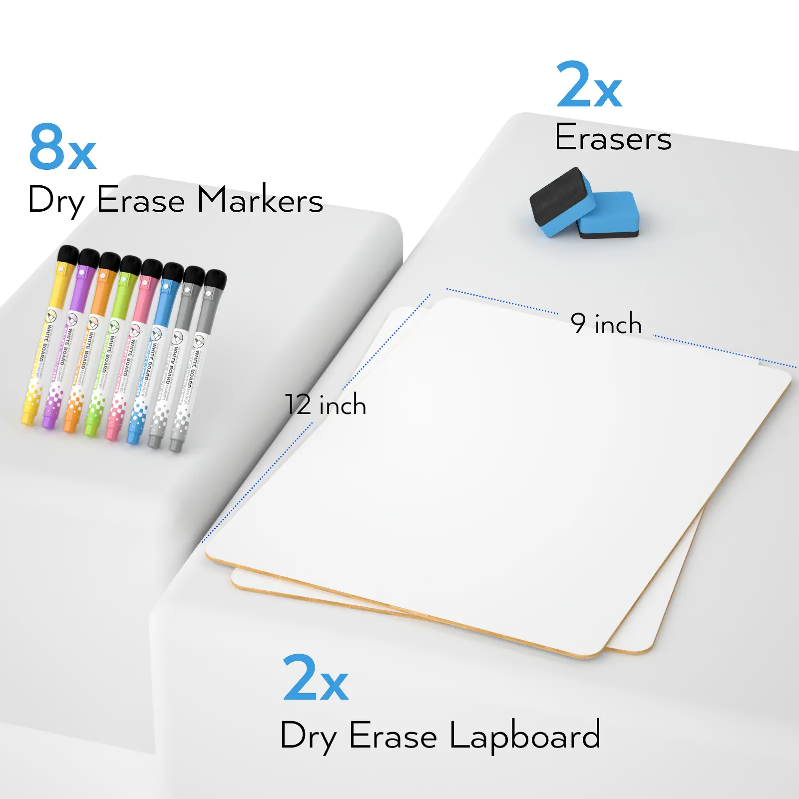 ·PackAGE CONTAINS: Come with 2 Pack A3 dry erase lap board and 8 water-based pens (red, blue, green, yellow, orange, purple, black x 2) and 2 erasers. great for used for math, spelling, penmanship, drawing and more