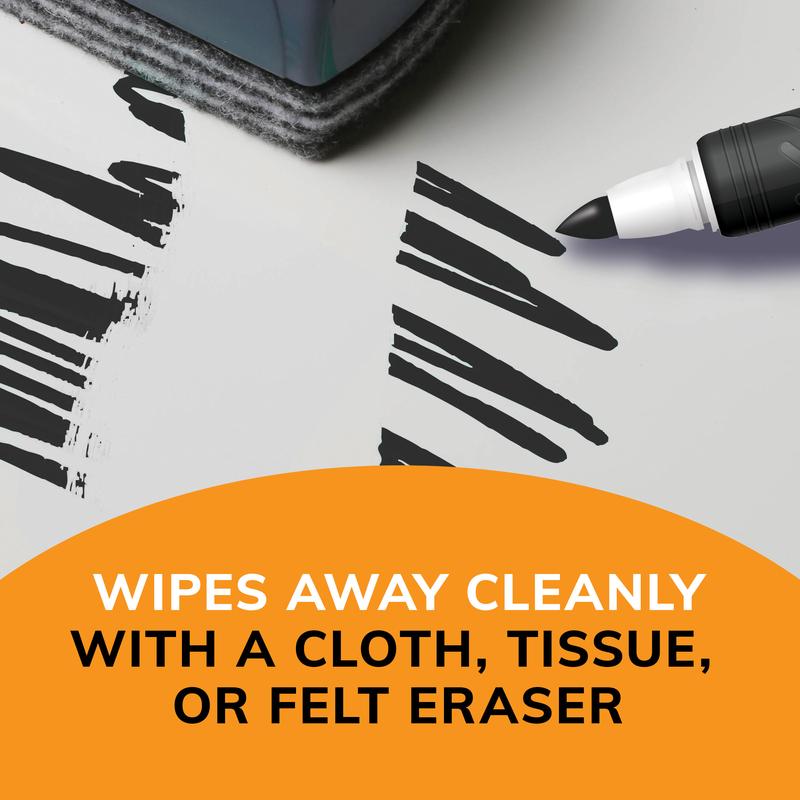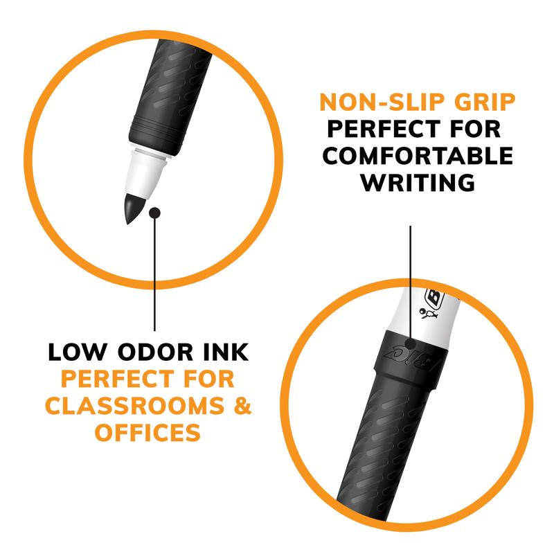 Make your ideas easy to read and understand with BIC Intensity Low Odor Dry Erase Markers. A fine tip design helps these BIC markers create bold, fine lines, making them a versatile option for detailed writing and drawing. Featuring bright, low-odor ink, BIC Intensity Low Odor Dry Erase Markers offer a smooth, consistent ink flow that results in bold markings on whiteboards, glass and other non-porous surfaces without smearing or leaving behind an unpleasant smell. Plus, these white board markers wipe away easily with a cloth, tissue or felt eraser for quick, effortless cleanup. Looking for chisel tip dry erase markers for office or school supplies? Non-toxic and ACMI-approved, BIC Intensity Dry Erase black markers are ideal for use at work, school or home — a great choice for brainstorming sessions, presentations, lessons, calendars, chore charts and more. Each pack contains 12 black low odor dry eraser markers, so you can stock up on dependable erasable markers and get going with a fresh batch of ideas every day. Feel prepared and confident for your next whiteboard session with BIC Intensity Low Odor Dry Erase Markers.