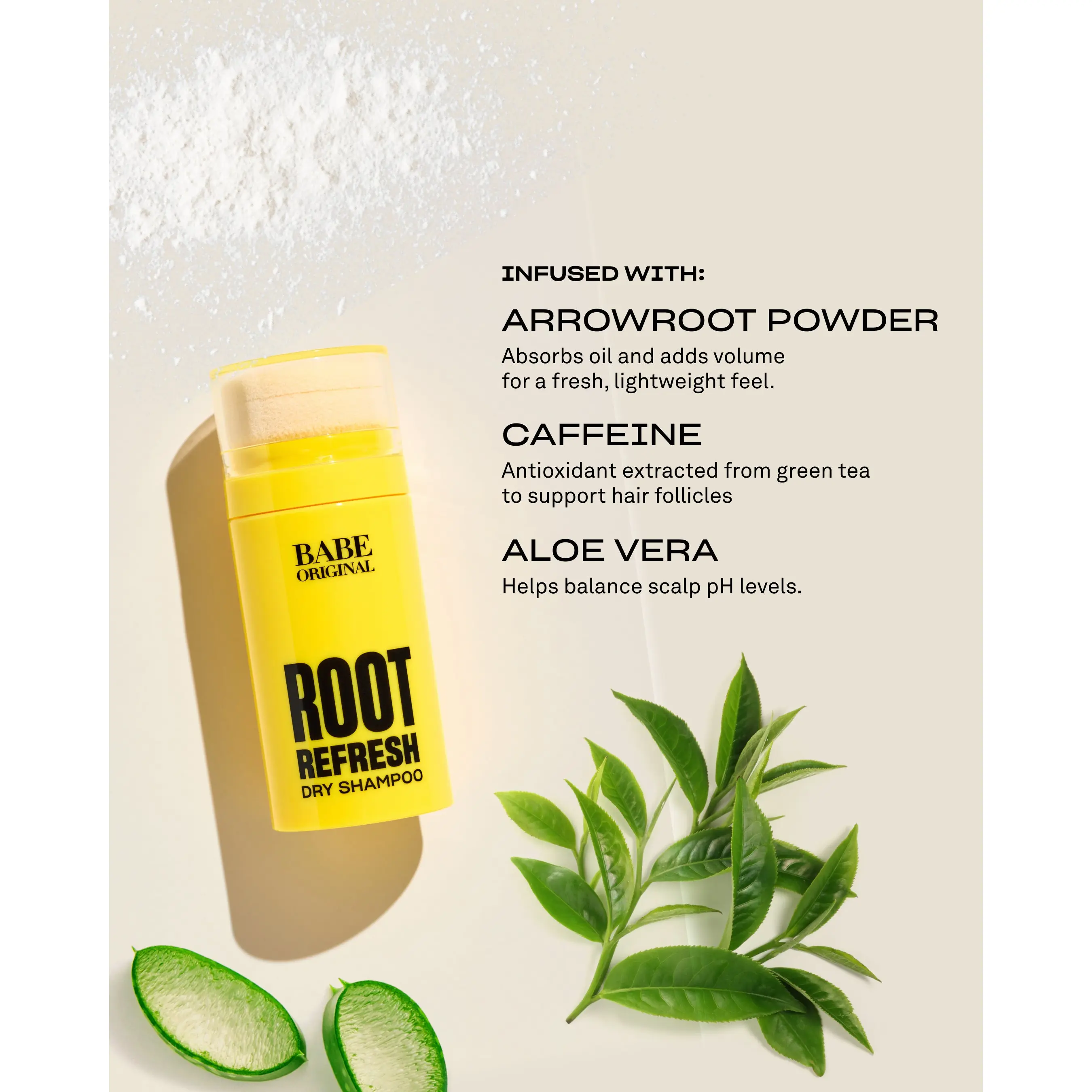 Aloe Vera, Caffeine, Panthenol, Rice Starch & Arrowroot Powder