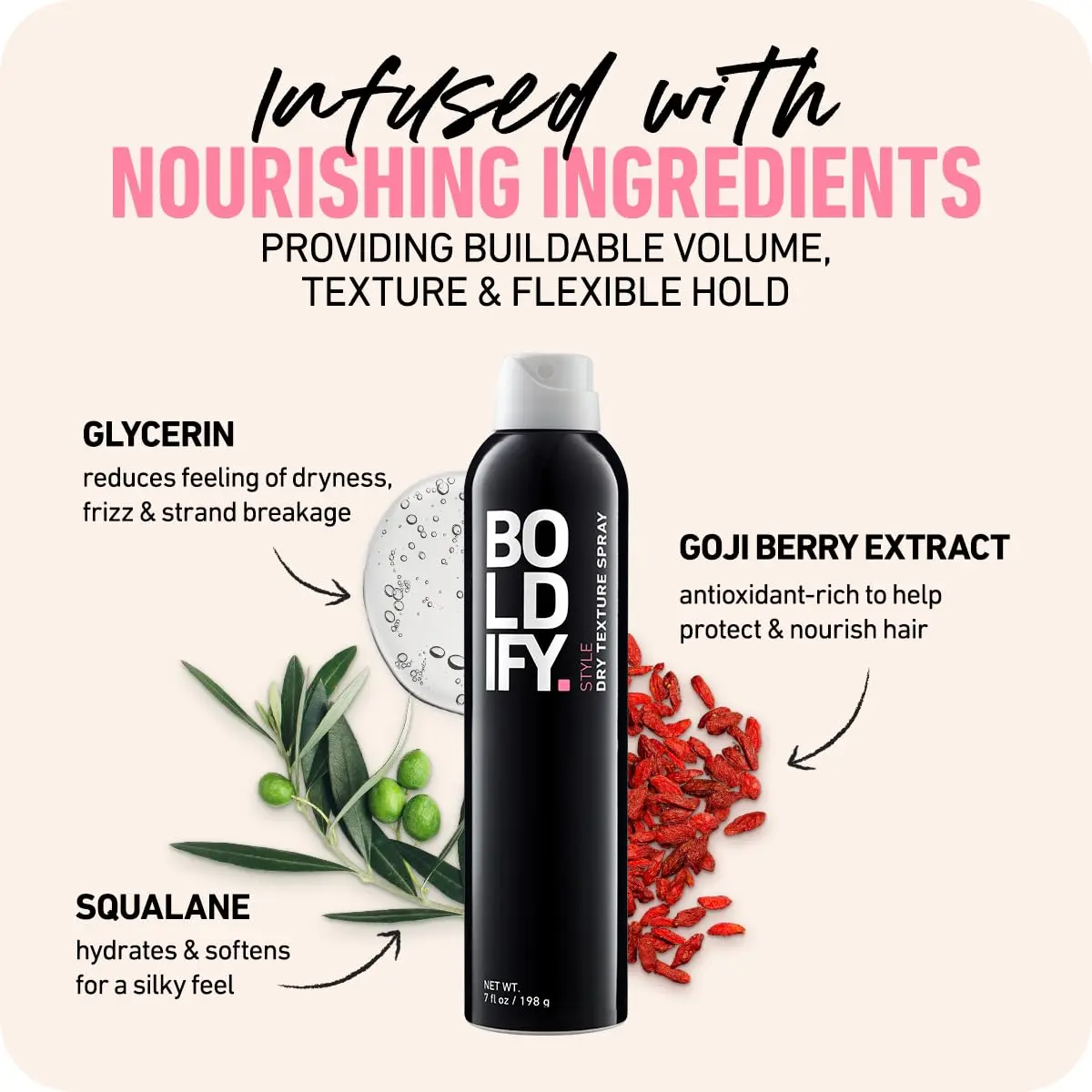 BoldIFY Dry Texturizing Spray offers beautiful volume, sexy tousled texture, and soft movement. It instantly plumps, texturizes, and separates each strand, creating a fuller, more dimensional style. Infused with bodifying polymers and UV protectant, it provides a natural matte finish and a chic, carefree look. Perfect for fine, medium, and thick hair.