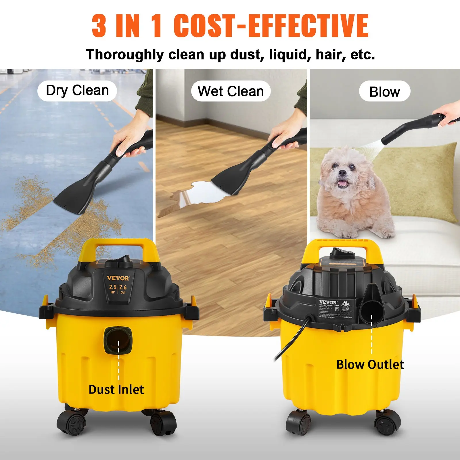 ·Unstoppable 2.5 HP Suction: Our wet dry vac brings you efficient suction while remaining quiet during heavy operations thanks to its powerful 2.5-peak HP motor. Thanks to its high 2.6-gallon capacity, the vac makes your whole space cleanup job a breeze, so you don’t have to empty the bucket frequently. It is ETL listed. Get ready to make rooms and areas sparkle.