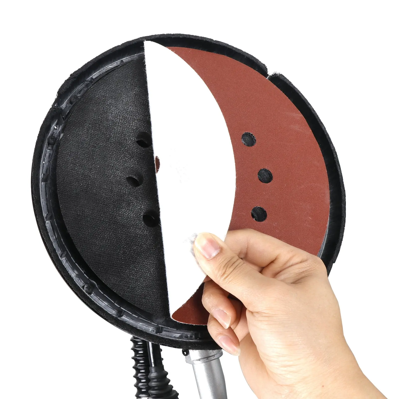 Heavy duty construction and Sturdy & DurablePortable grip handle for easy movementVariable Speed Control - 6 Positions Between 1,000 to 2,200rpmSanding head diameter 9.8 inches6 Sander Discs included (Dia. 8.9 inches)Light-weight, easy to reach almost any corner and angleProvide a superior finish and is faster than conventional finishing methodsAllows you to rotate the sander 90 degrees around