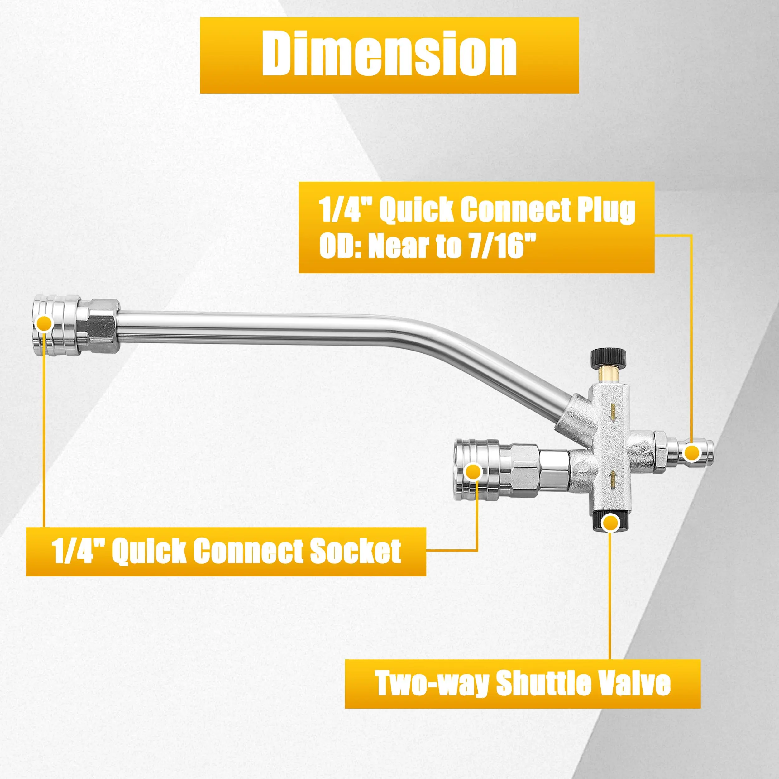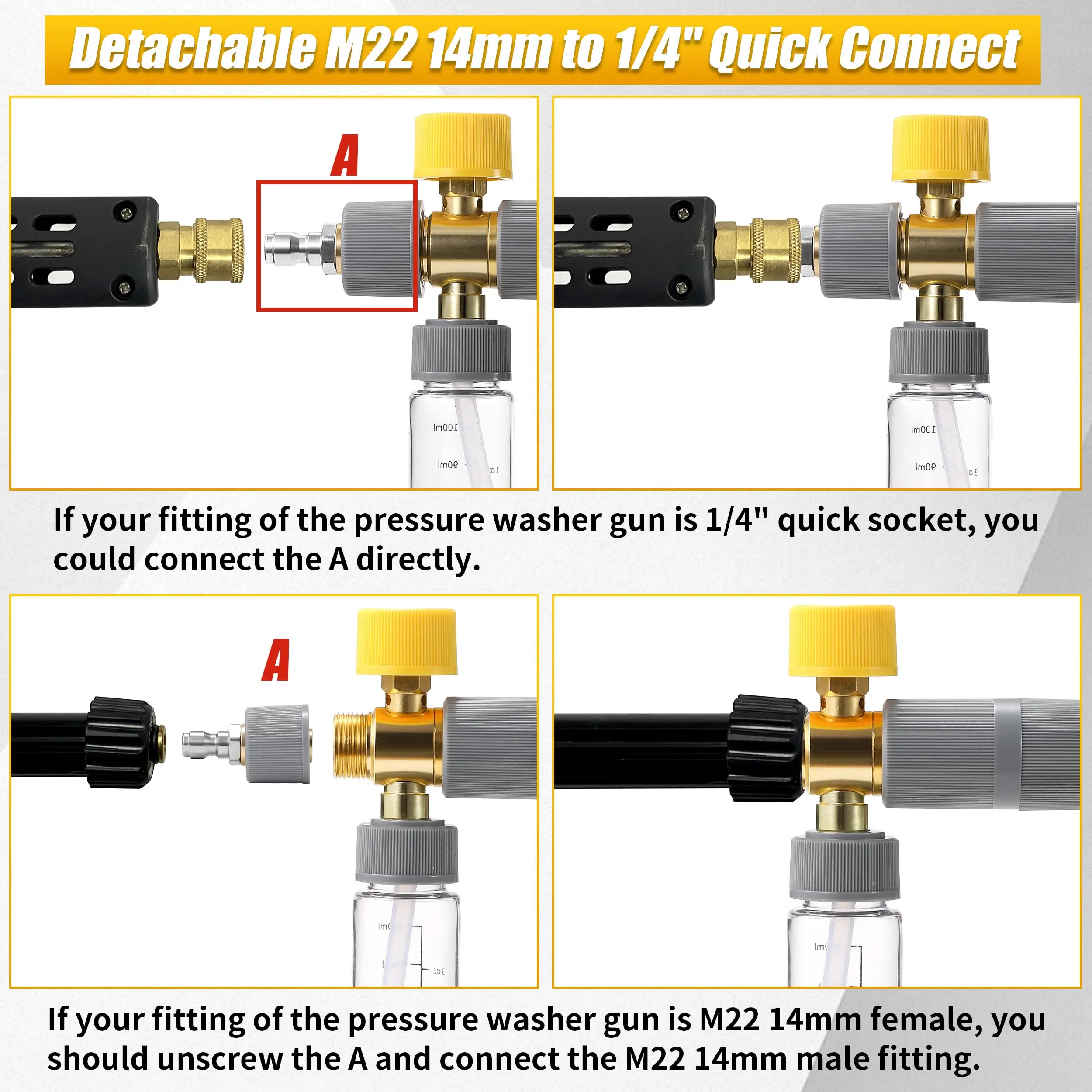 The dual connector foam cannon has a dual 1/4" quick-connect system. The longer end connects to the pressure washer tip, while the shorter end attaches to the foam cannon. This ensures seamless water flow. 🔄