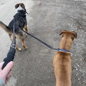 Absolutely love this leash! I use it with my two huskies and it never tangles. The swivel design is a game changer and the bungee helps absorb their pulling. Walks are way less chaotic now!