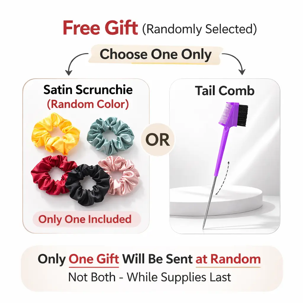 Each order includes one complimentary hair accessory, randomly selected from a tail comb or a satin scrunchie.