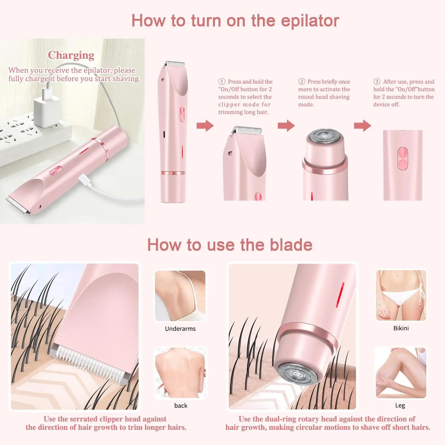 【Multifunctional Blade】R type clipper blade and round hypo-allergenic stainless steel blades,Safe and skin friendly. Electric Bikini Trimmer for Women on bikinis and underarms.