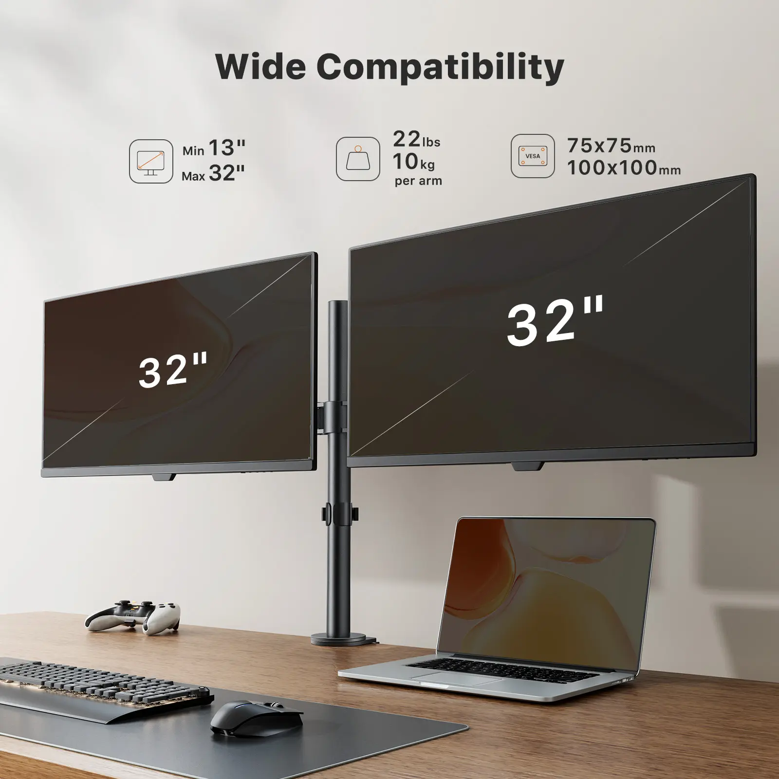 ·Universal Compatibility: Experience the versatility of our double monitor stand, designed to fit 13-32 inch monitors up to 17.6 lbs each. Compatible with 75x75 mm and 100x100 mm VESA, this monitor desk mount includes hardware for C-clamp and grommet installation, making it a perfect fit for any setup.