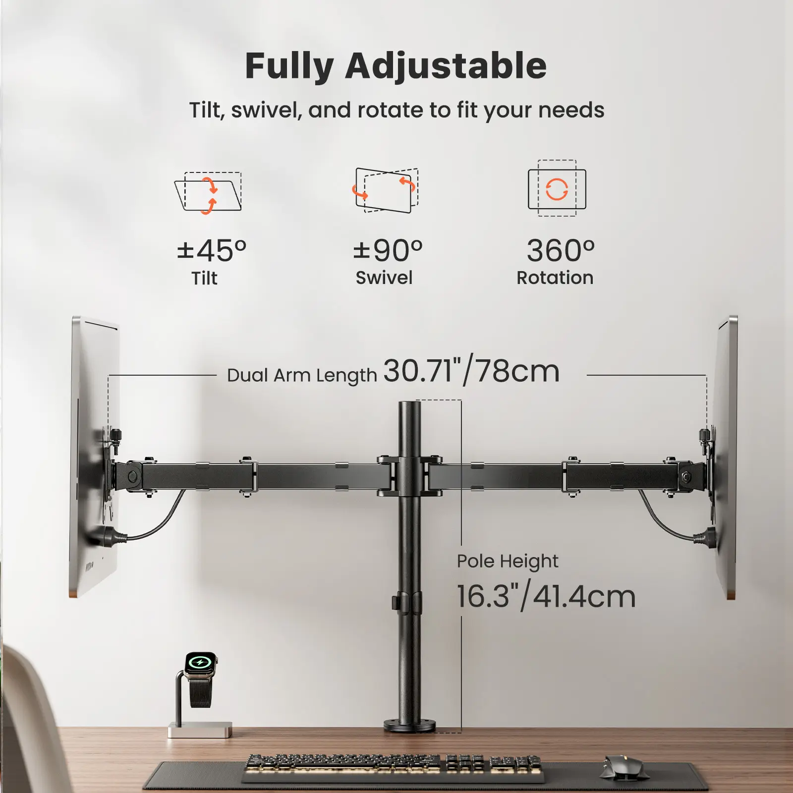 ·Fully Adjustable: Achieve the perfect screen position with our monitor stands for 2 monitors. Enjoy ±90° tilt, ±90° swivel, and 360° rotation, allowing you to customize your view effortlessly with this dual monitor stand.