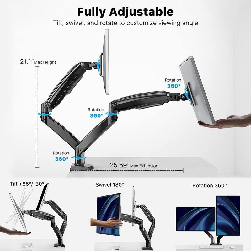 Β·Full Motion Adjustments: This heavy duty dual monitor arm allows your screens to swivel from -90Β° to +90Β°, tilt from -30Β° to +85Β° and rotate 360Β°. Conveniently set your monitors at an optimal angle to increase productivity and comfort.