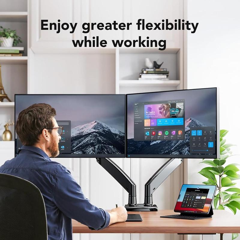 Β·Perfect Desk Organizer: This monitor arms for 2 monitors free up much more valuable space on your desk. The integrated cable management system keeps your cords in order and out of sight. Now your workspace is clutter-free!