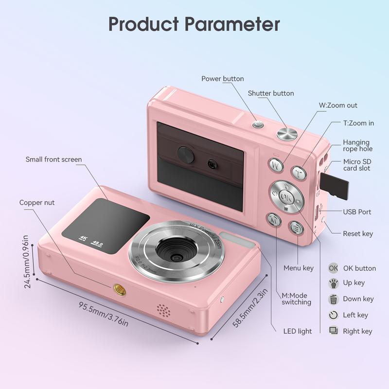 Equipped with a 2.4" rear screen and 1.3" front display,Long press the "OK" button to flip the unique dual screens, allowing you to switch shooting angles at any time.Whether you're capturing daily moments or filming vlogs, framing your shot is simple and accurate—no guesswork, just great selfies.