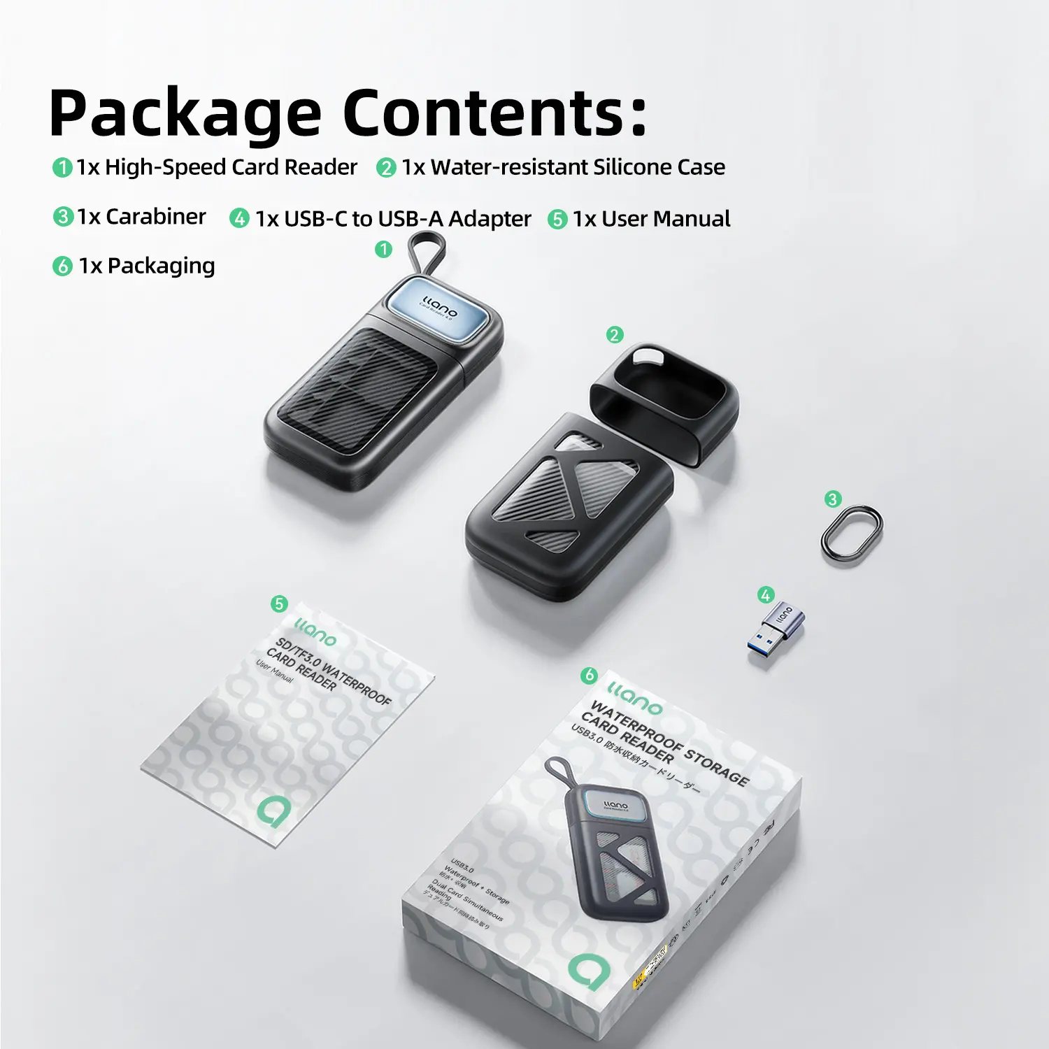 Inside the box, you’ll find the card reader, a Type-C cable, a USB-A adapter, a silicone protective case, and an aluminum alloy carabiner. Ready to simplify your file transfers? Grab this sleek, rugged card reader and experience fast, reliable data access wherever you go!
