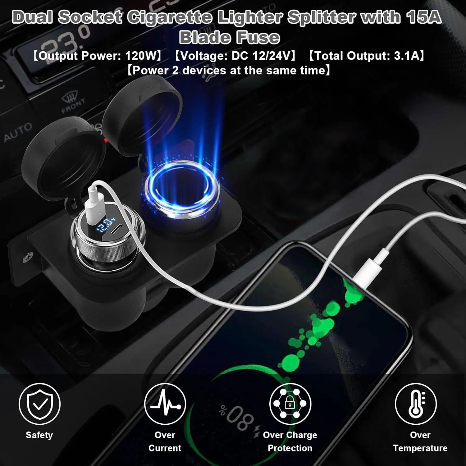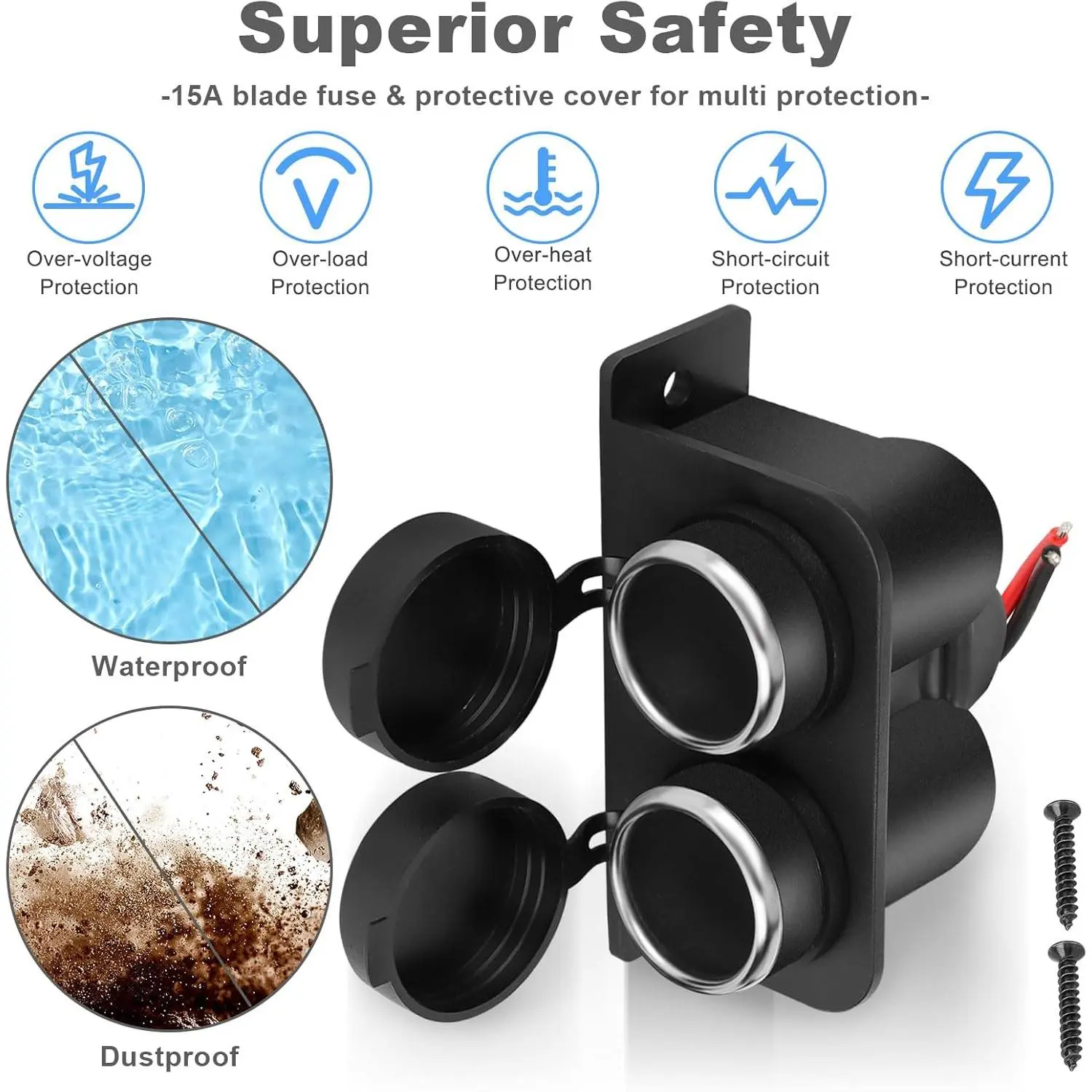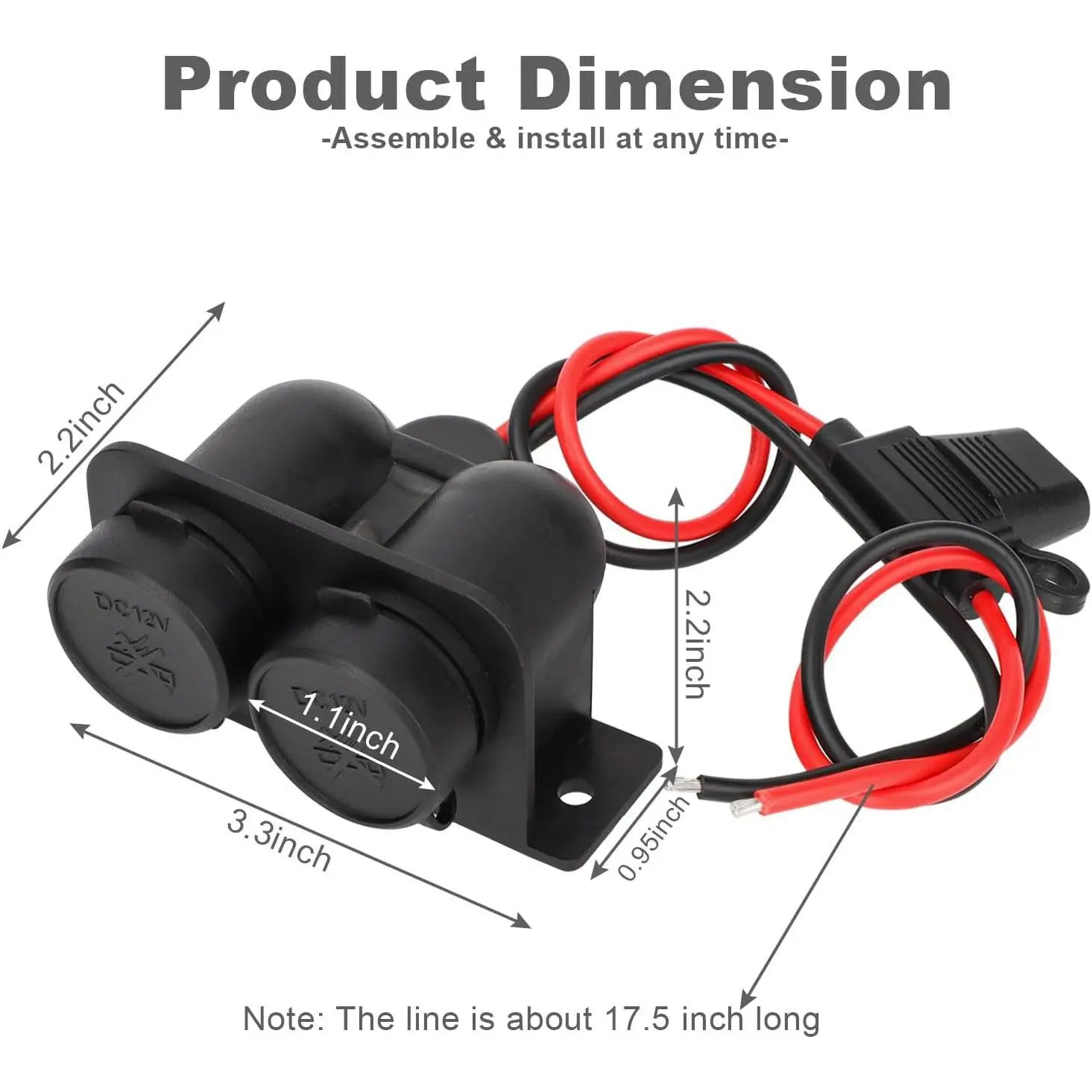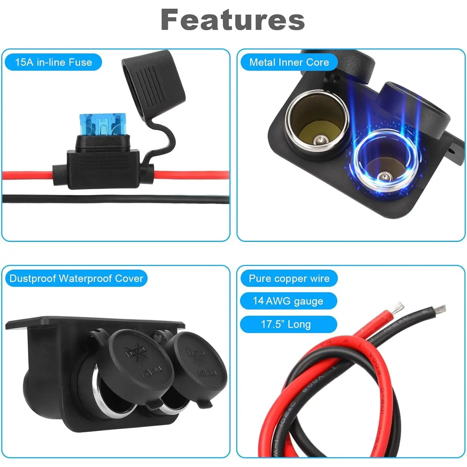 12V/24V 3.1A Dual Socket]The 12V Cigarette Lighter Socket is design with 2 female sockets, which can be used at the same time, the total output of the two ports is 3.1A, the output power is 120W, the voltage is DC 12V-24V, suitable for 12-24V vehicle power supply equipment, such as GPS, Dash Cam, Vacuum Cleaner, Car Fridge, Heated Seats, and Sat Nav, ect.[DURABLE PLASTIC & METAL CORE]The housing of this 12V motorcycle power outlet is made of durable plastic, which has high current resistance, high temperature resistance and abrasion resistance.Besides the dual cigarette lighter socket are made of all metal inner core, so solid and strong.The solid construction makes the 12v motorcycle cigarette lighter last a long time.[15A BLADE FUSE & DUSTPROOF WATERPROOF COVER]Come with a standard 15A in-line fuse, protect your device from over-voltage, over-heating, over-load, or short-circuit.Equipped with waterproof and dustproof cover, effectively protects the marine power outlet against sudden water splashes and influence of dust, avoid short-circuited and poorly contacted, which effectively prolongs the service life.[14AWG GAUGE PURE COPPER CABLE & EASY TO INSTALL]The Cable of the 12v plug and socket is made of pure copper wire, the Gauge of the cable is 14AWG, which has better conductivity.The long length of 17.5 inches is conveninent for installation.Just connect the RED wire to ''+'' and BLACK wire to "-".[WIDE USES & PACKAGE INCLUDES]The 12 volt outlet socket fits for any vehicles powered by DC 12V/24V, such as car, motorcycle, boat, marine, truck, RV, golf cart, ATV, UTV, Van etc. It's can power the GPS, dashcam, air purifier, car vacuum cleaners, car heater etc, and also be used in conjunction with a car charger to charge your phone. (Package includes: 1* 12V Cigarette Lighter Socket2* Mounting Screws)