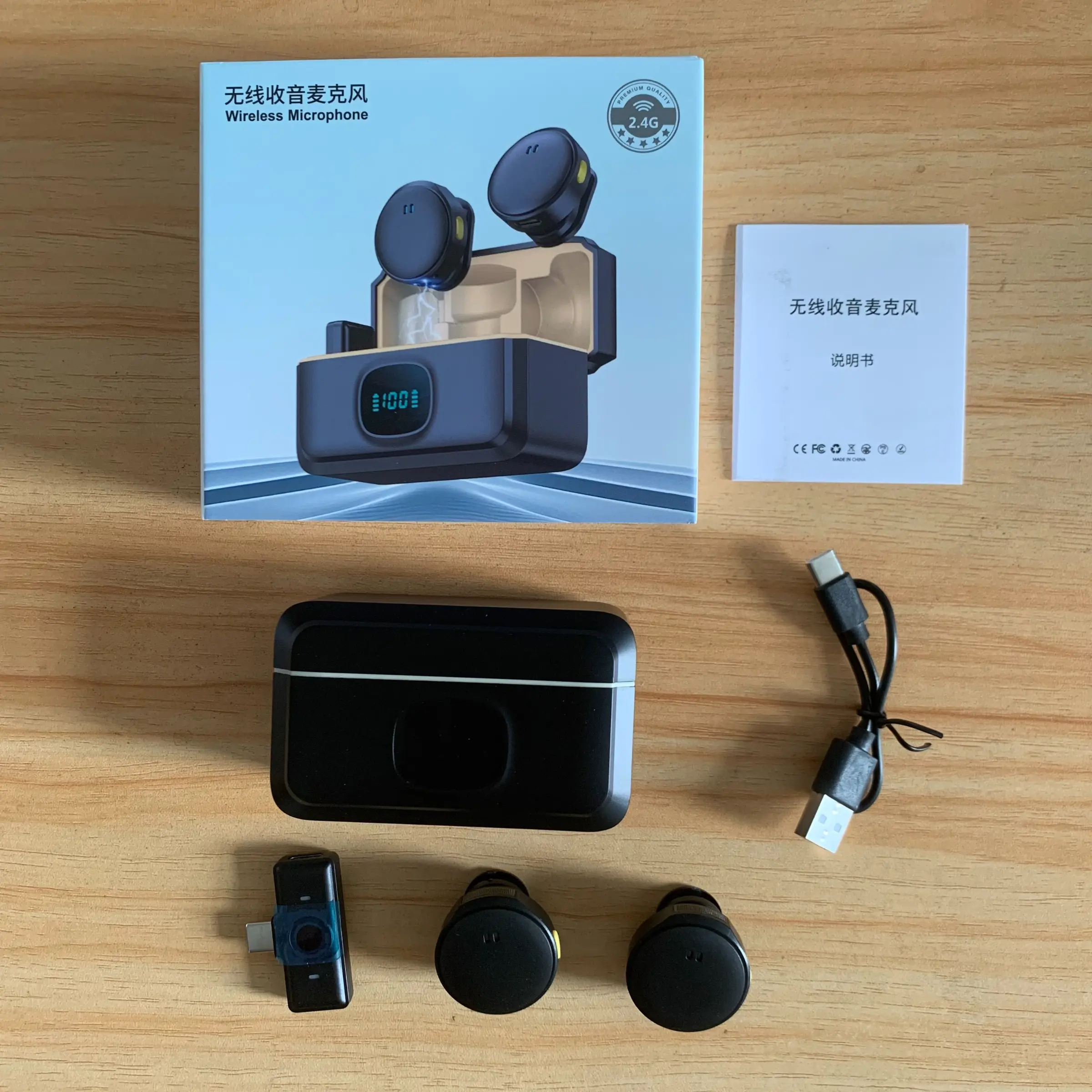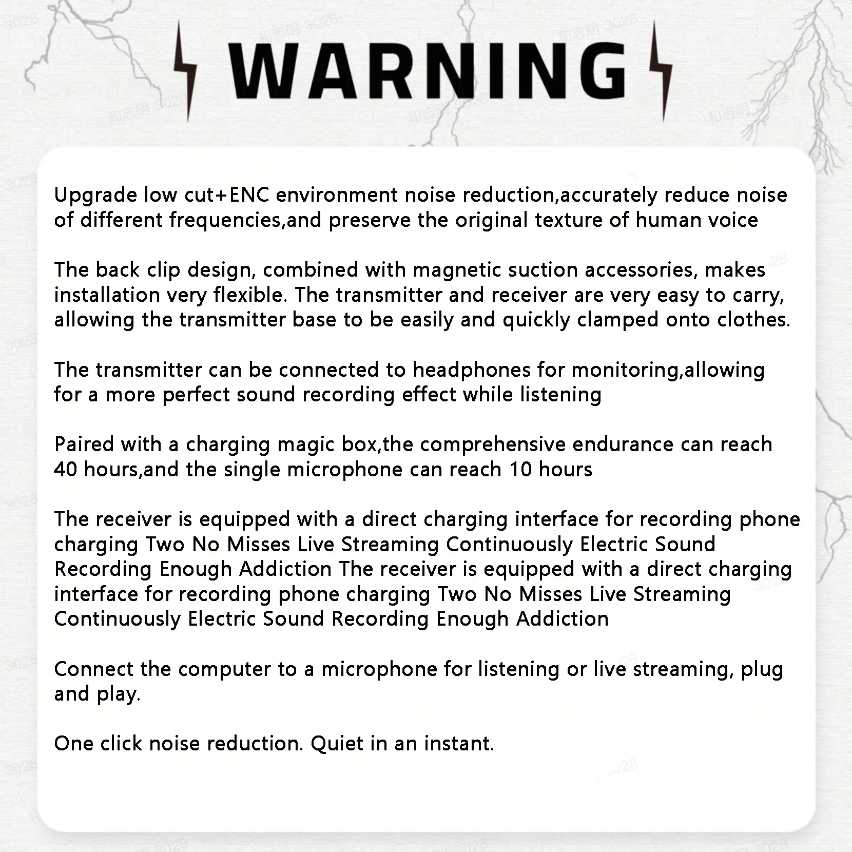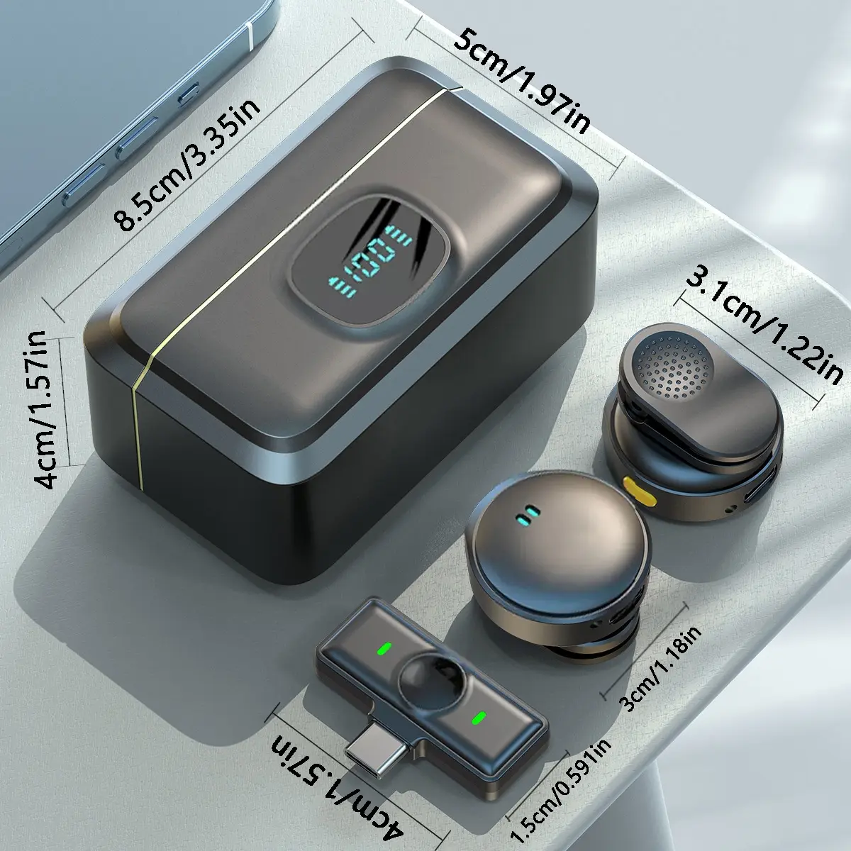 Ever struggled with bulky mics and tangled cables during your recordings? This dual wireless lapel microphone is here to simplify your setup and elevate your audio game. Designed for mobile pros and casual creators alike, it offers crystal-clear sound with smart noise reduction that cuts background noise while keeping your voice natural. Clip it easily onto your shirt or tie thanks to the magnetic and back clip design—no fumbling around needed. Whether you're recording interviews, streaming, or making videos on your iPhone, Android, or PC, this mic’s got you covered with broad compatibility and plug-and-play convenience. The compact transmitter and receiver are lightweight and portable, perfect for outdoor shoots or on-the-go content creation. Plus, with up to 10 hours per mic and 40 hours total battery life from the charging case, you can record all day without worrying about power. Real-time headphone monitoring ensures your sound is always on point. Inside the box, you get the wireless mic set with charging case and accessories to get started right away. Ready to capture your best audio effortlessly? Grab this wireless lapel mic and say goodbye to cables and noise!