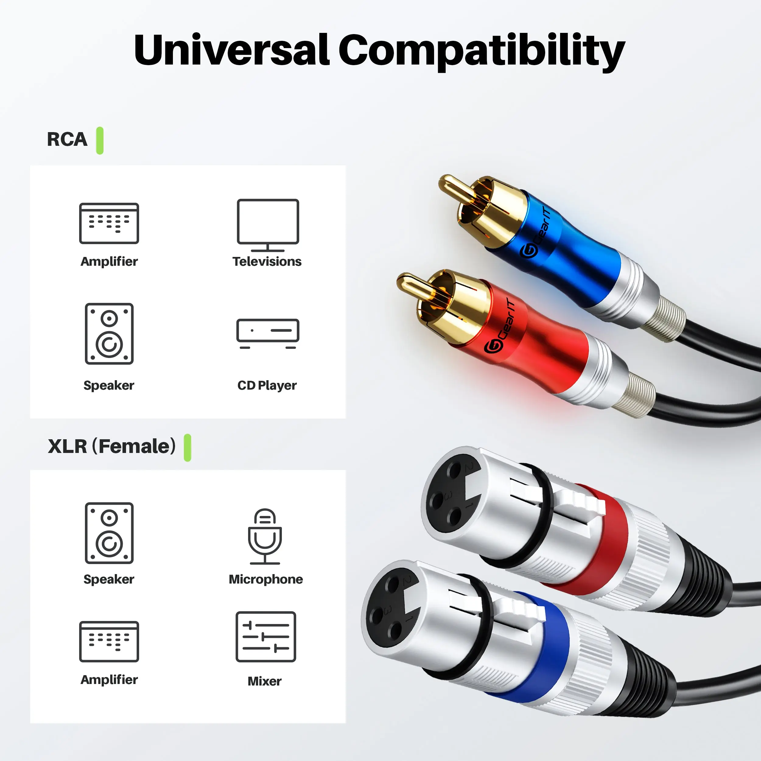 Ever struggled with poor audio connections during your gigs or home setup? This dual XLR female to dual RCA male cable is your go-to solution for crystal-clear sound. Crafted with oxygen-free copper conductors and spiral braided shielding, it cuts down interference and delivers professional-grade audio every time. Whether you're hooking up microphones to mixers, connecting your AV receiver to speakers, or syncing recording equipment, this cable handles it all with ease. The heavy-duty metal connectors and molded strain relief provide durability, while the soft PVC jacket makes it flexible and easy to manage. Available in multiple lengths, you get the perfect fit for your setup. Inside the box, you'll find a high-quality cable ready to upgrade your audio experience. Ready to boost your sound game? Grab this cable and hear the difference today!