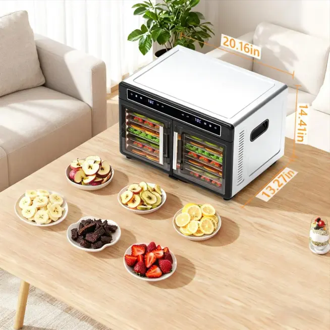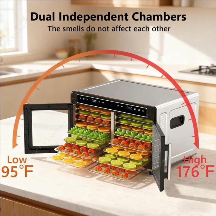 Introducing our Dual-Zone Commercial Food Dehydrator, designed for unparalleled efficiency. This 1200W dehydrator features two independent drying chambers. Process two different foods simultaneously without cross-contamination. Each chamber offers precise control over temperature (95°F-176°F in 9°F increments) and time (up to 72 hours in 30-minute increments).