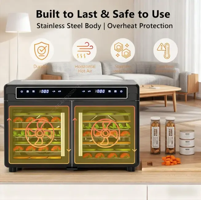 The dehydrator has a durable stainless steel exterior and metal interior chambers. Rear heating technology ensures even heat distribution. Equipped with built-in lighting, "Keep Warm," and "Fast/Raw" functions. The overheat protection device ensures safety. High-quality trays make food easy to detach and clean.