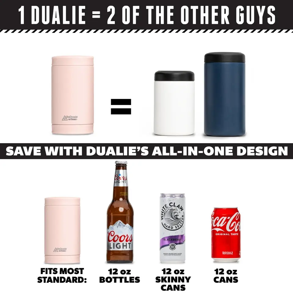 ·FITS 3 SIZES IN 1: Unlike the other guys that require 2 or more can coolers for different sizes, you only need 1 DUALIE to enjoy your favorite drinks; DUALIE fits most standard shape 12 oz cans, tall slim / skinny cans, and 12 oz bottles