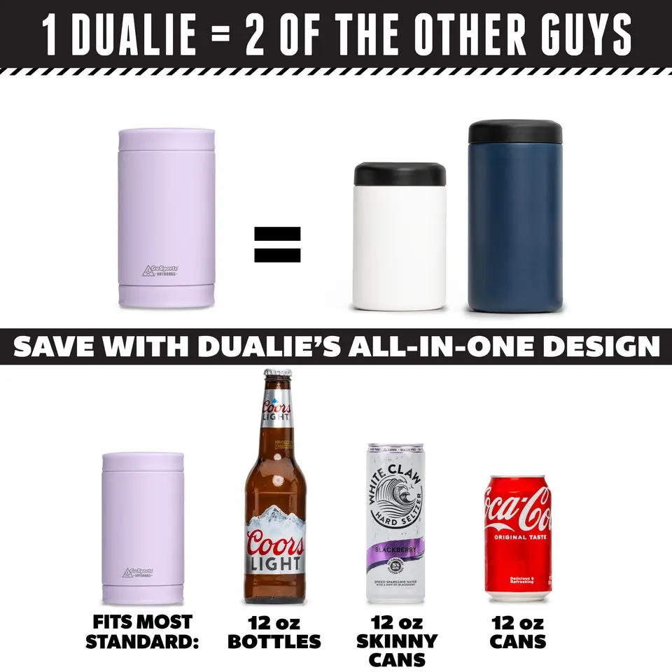 ·FITS 3 SIZES IN 1: Unlike the other guys that require 2 or more can coolers for different sizes, you only need 1 DUALIE to enjoy your favorite drinks; DUALIE fits most standard shape 12 oz cans, tall slim / skinny cans, and 12 oz bottles