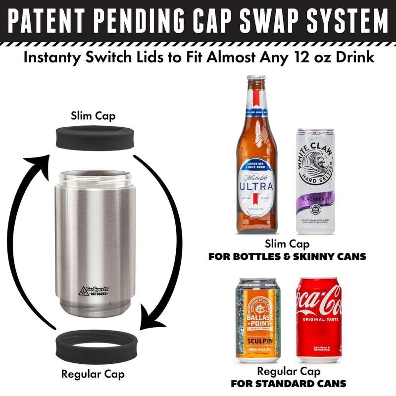 The GoSports Outdoors DUALIE is a new, premium insulation system for your drinks, all at an amazing value! With a single DUALIE you get a 3-in-1 can insulator that fits standard 12 oz cans, slim cans, and beer bottles, so there's no need to buy multiple can coolers. Our dual cap design allows you to easily swap the top and bottom lids to accommodate different beverages. Featuring dual-walled construction and made from durable stainless steel, the DUALIE keeps your drinks chilled for hours and protects your hands and tabletops from unpleasant condensation. It's great for sodas, seltzers, beer, and more! The DUALIE also fits inside most modern car cup holders, and our Cuddy cooler, and comes in a variety of colors. Don't let your drinks go warm, grab your favorite DUALIE today!