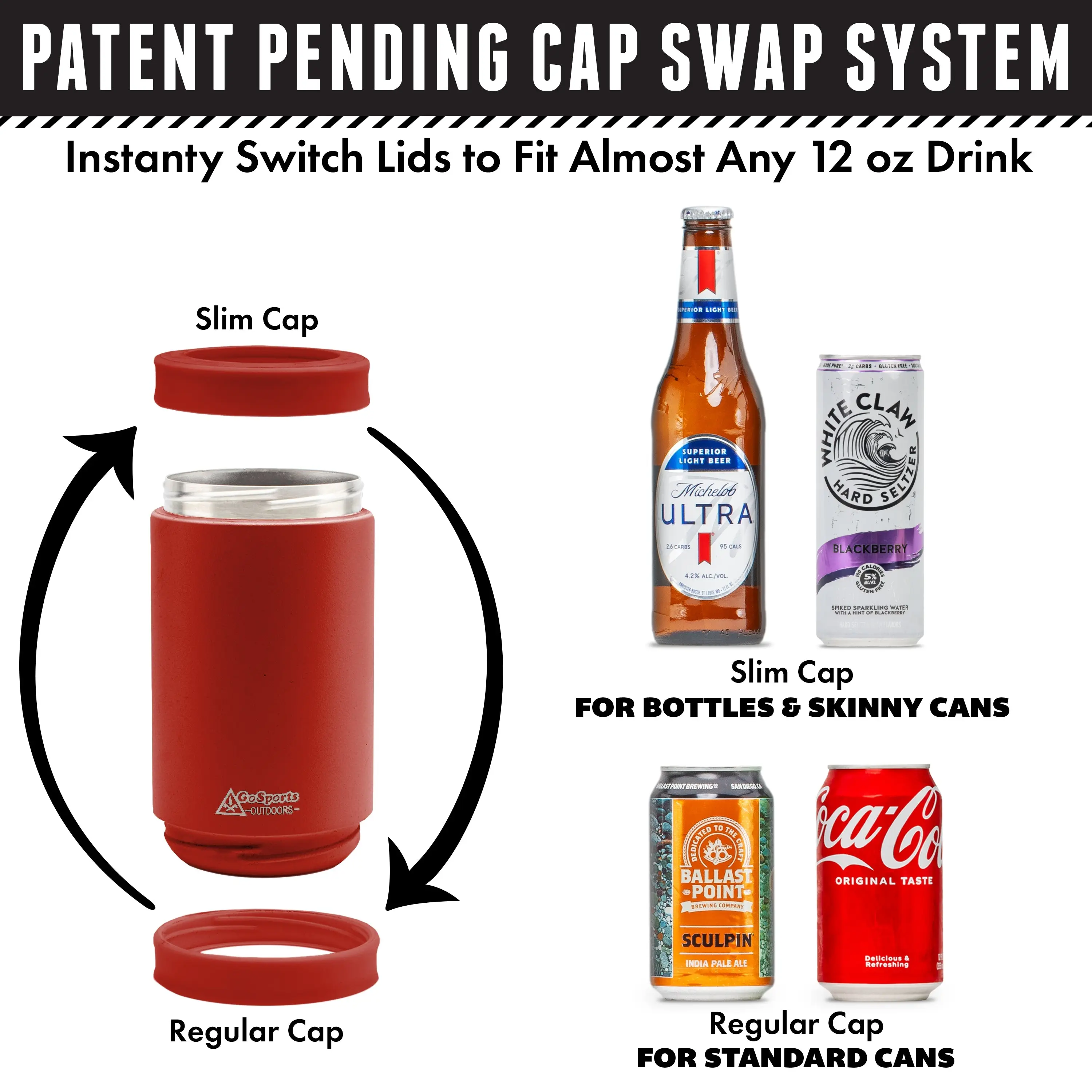 ·SWITCH DRINKS INSTANTLY: New patent pending cap swap system allows DUALIE to fit a different size beverage in seconds; DUALIE works with all major soda, beer and seltzer brands