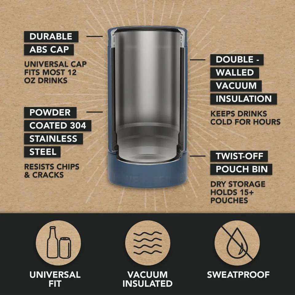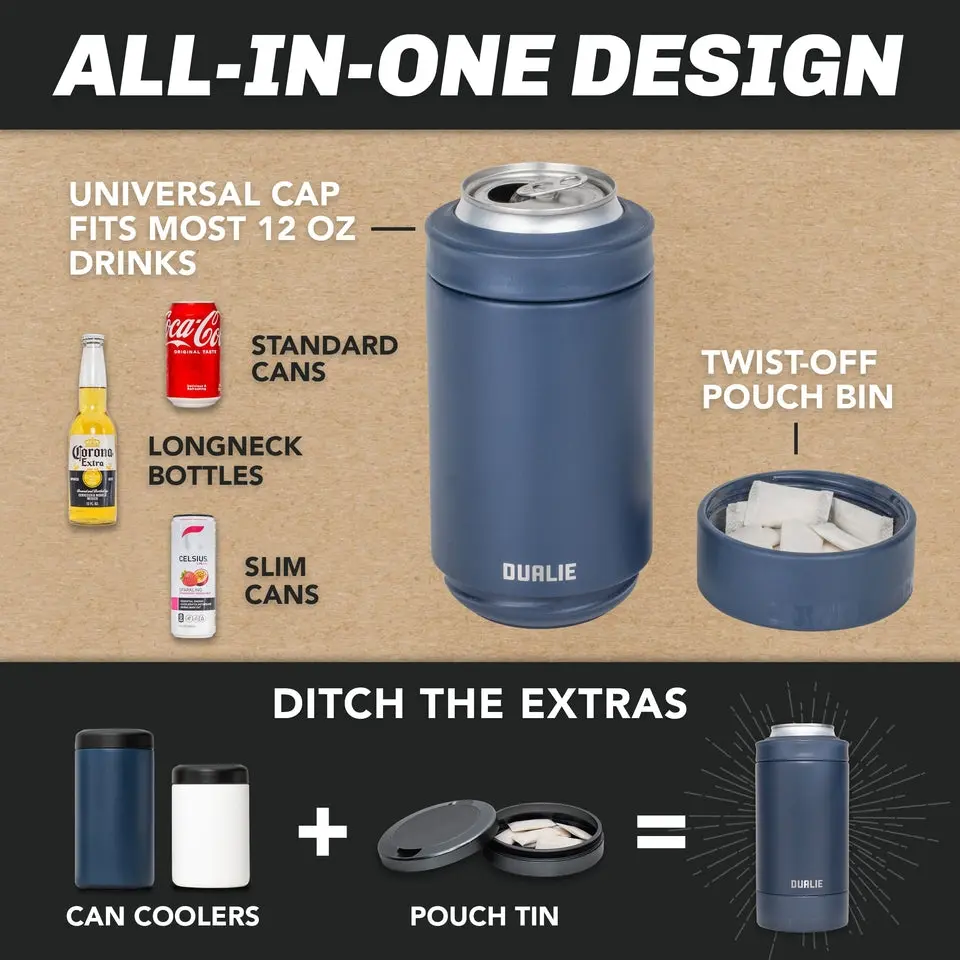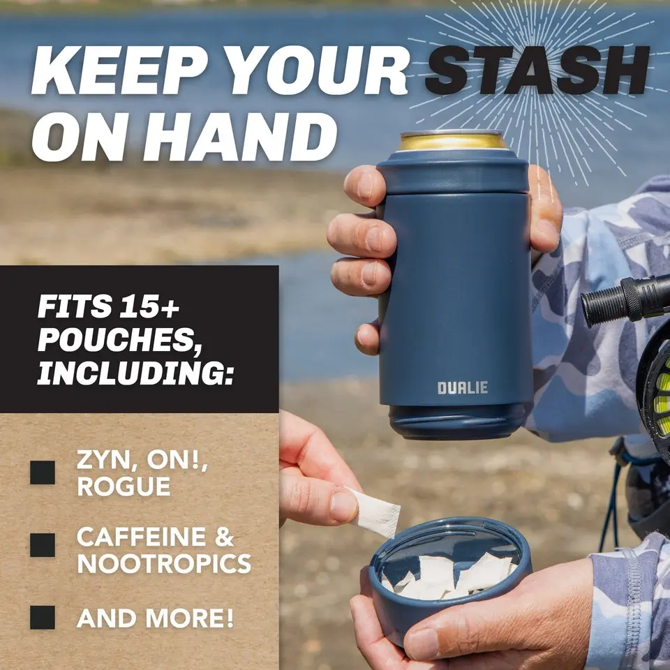 Upgrade from basic can insulators and nicotine pouch containers! DUALIE Lower Deckie combines our top selling 3-in-1 can cooler with a built-in pouch holder. A single DUALIE Lower Deckie fits standard 12 oz cans, slim cans, and beer bottles, so there's no need to buy multiple can coolers. Easily twist off the base for a hidden storage compartment that can hold at least one pack of your favorite pouches. Featuring dual-walled construction and made from durable stainless steel, the DUALIE Lower Deckie keeps your drinks chilled for hours and your pouches on hand for easy access. It's great for sodas, seltzers, beer, and any nicotine or dipping pouch! The DUALIE Lower Deckie also fits inside most modern car cup holders, and our Cuddy cooler, and comes in a variety of colors. Sip and dip with DUALIE Lower Deckie!